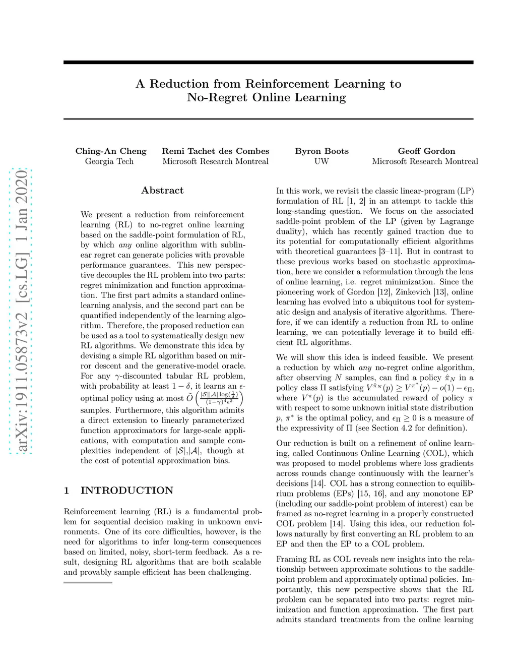 We present a reduction from reinforcement learning (RL) to no-regret online learning based on the saddle-point formulation of RL, by which "any" online algorithm with sublinear regret can generate policies with provable performance guarantees. This new perspective decouples the RL problem into two parts: regret minimization and function approximation. The first part admits a standard online-learning analysis, and the second part can be quantified independently of the learning algorithm. Therefore, the proposed reduction can be used as a tool to systematically design new RL algorithms. We demonstrate this idea by devising a simple RL algorithm based on mirror descent and the generative-model oracle. For any -discounted tabular RL problem, with probability at least , it learns an -optimal policy using at most samples. Furthermore, this algorithm admits a direct extension to linearly parameterized function approximators for large-scale applications, with computation and sample complexities independent of ,, though at the cost of potential approximation bias.