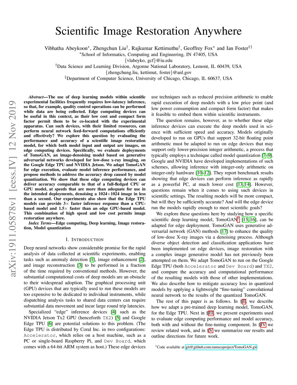 The use of deep learning models within scientific experimental facilities frequently requires low-latency inference, so that, for example, quality control operations can be performed while data are being collected. Edge computing devices can be useful in this context, as their low cost and compact form factor permit them to be co-located with the experimental apparatus. Can such devices, with their limited resources, can perform neural network feed-forward computations efficiently and effectively? We explore this question by evaluating the performance and accuracy of a scientific image restoration model, for which both model input and output are images, on edge computing devices. Specifically, we evaluate deployments of TomoGAN, an image-denoising model based on generative adversarial networks developed for low-dose x-ray imaging, on the Google Edge TPU and NVIDIA Jetson. We adapt TomoGAN for edge execution, evaluate model inference performance, and propose methods to address the accuracy drop caused by model quantization. We show that these edge computing devices can deliver accuracy comparable to that of a full-fledged CPU or GPU model, at speeds that are more than adequate for use in the intended deployments, denoising a 1024 x 1024 image in less than a second. Our experiments also show that the Edge TPU models can provide 3x faster inference response than a CPU-based model and 1.5x faster than an edge GPU-based model. This combination of high speed and low cost permits image restoration anywhere.