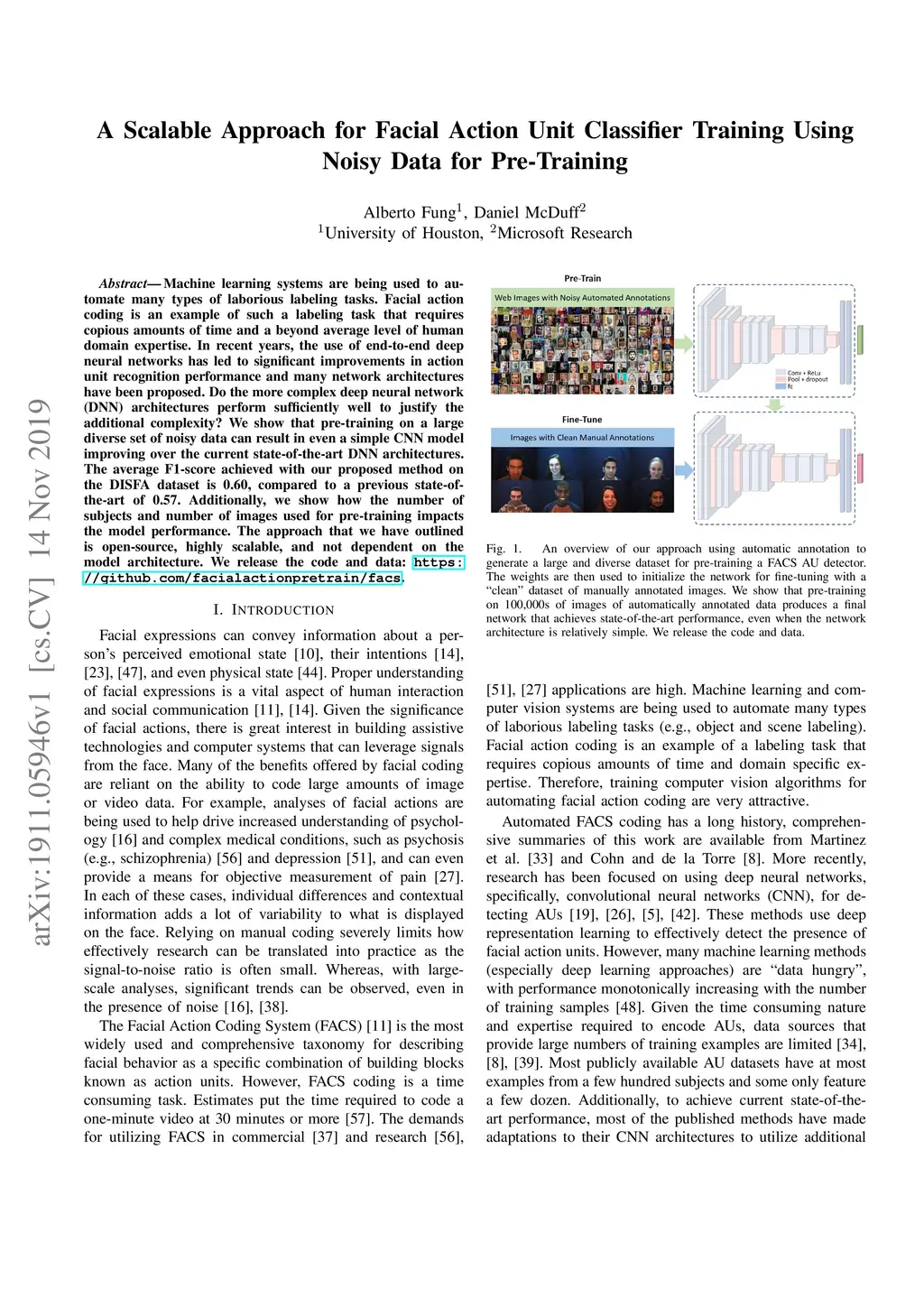 Machine learning systems are being used to automate many types of laborious labeling tasks. Facial actioncoding is an example of such a labeling task that requires copious amounts of time and a beyond average level of human domain expertise. In recent years, the use of end-to-end deep neural networks has led to significant improvements in action unit recognition performance and many network architectures have been proposed. Do the more complex deep neural network(DNN) architectures perform sufficiently well to justify the additional complexity? We show that pre-training on a large diverse set of noisy data can result in even a simple CNN model improving over the current state-of-the-art DNN architectures.The average F1-score achieved with our proposed method on the DISFA dataset is 0.60, compared to a previous state-of-the-art of 0.57. Additionally, we show how the number of subjects and number of images used for pre-training impacts the model performance. The approach that we have outlined is open-source, highly scalable, and not dependent on the model architecture. We release the code and data: https://github.com/facialactionpretrain/facs.