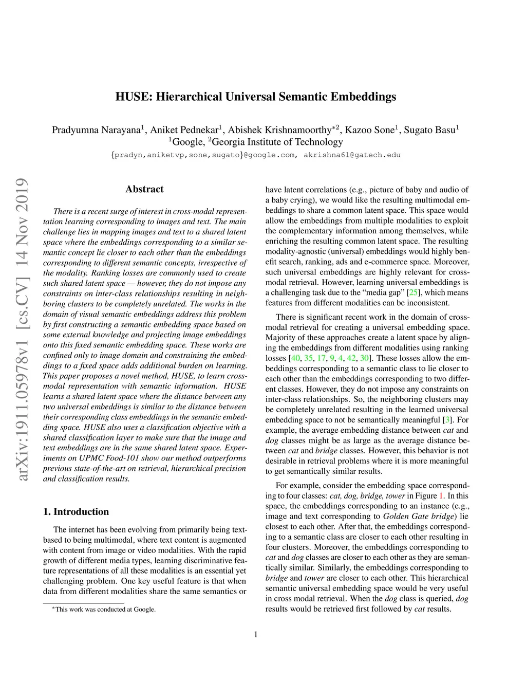 There is a recent surge of interest in cross-modal representation learning corresponding to images and text. The main challenge lies in mapping images and text to a shared latent space where the embeddings corresponding to a similar semantic concept lie closer to each other than the embeddings corresponding to different semantic concepts, irrespective of the modality. Ranking losses are commonly used to create such shared latent space -- however, they do not impose any constraints on inter-class relationships resulting in neighboring clusters to be completely unrelated. The works in the domain of visual semantic embeddings address this problem by first constructing a semantic embedding space based on some external knowledge and projecting image embeddings onto this fixed semantic embedding space. These works are confined only to image domain and constraining the embeddings to a fixed space adds additional burden on learning. This paper proposes a novel method, HUSE, to learn cross-modal representation with semantic information. HUSE learns a shared latent space where the distance between any two universal embeddings is similar to the distance between their corresponding class embeddings in the semantic embedding space. HUSE also uses a classification objective with a shared classification layer to make sure that the image and text embeddings are in the same shared latent space. Experiments on UPMC Food-101 show our method outperforms previous state-of-the-art on retrieval, hierarchical precision and classification results.