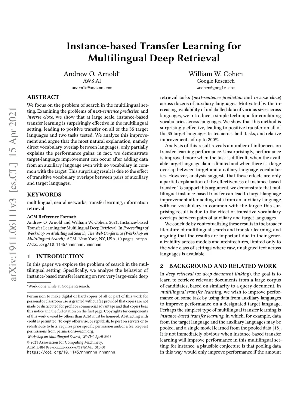 We focus on the problem of search in the multilingual setting. Examining the problems of next-sentence prediction and inverse cloze, we show that at large scale, instance-based transfer learning is surprisingly effective in the multilingual setting, leading to positive transfer on all of the 35 target languages and two tasks tested. We analyze this improvement and argue that the most natural explanation, namely direct vocabulary overlap between languages, only partially explains the performance gains: in fact, we demonstrate target-language improvement can occur after adding data from an auxiliary language even with no vocabulary in common with the target. This surprising result is due to the effect of transitive vocabulary overlaps between pairs of auxiliary and target languages.