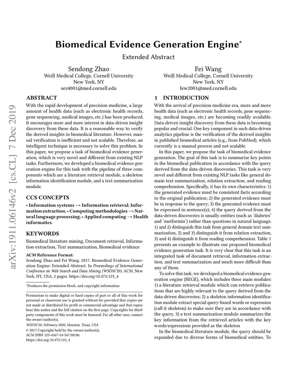 With the rapid development of precision medicine, a large amount of health data (such as electronic health records, gene sequencing, medical images, etc.) has been produced. It encourages more and more interest in data-driven insight discovery from these data. It is a reasonable way to verify the derived insights in biomedical literature. However, manual verification is inefficient and not scalable. Therefore, an intelligent technique is necessary to solve this problem. In this paper, we propose a task of biomedical evidence generation, which is very novel and different from existing NLP tasks. Furthermore, we developed a biomedical evidence generation engine for this task with the pipeline of three components which are a literature retrieval module, a skeleton information identification module, and a text summarization module.