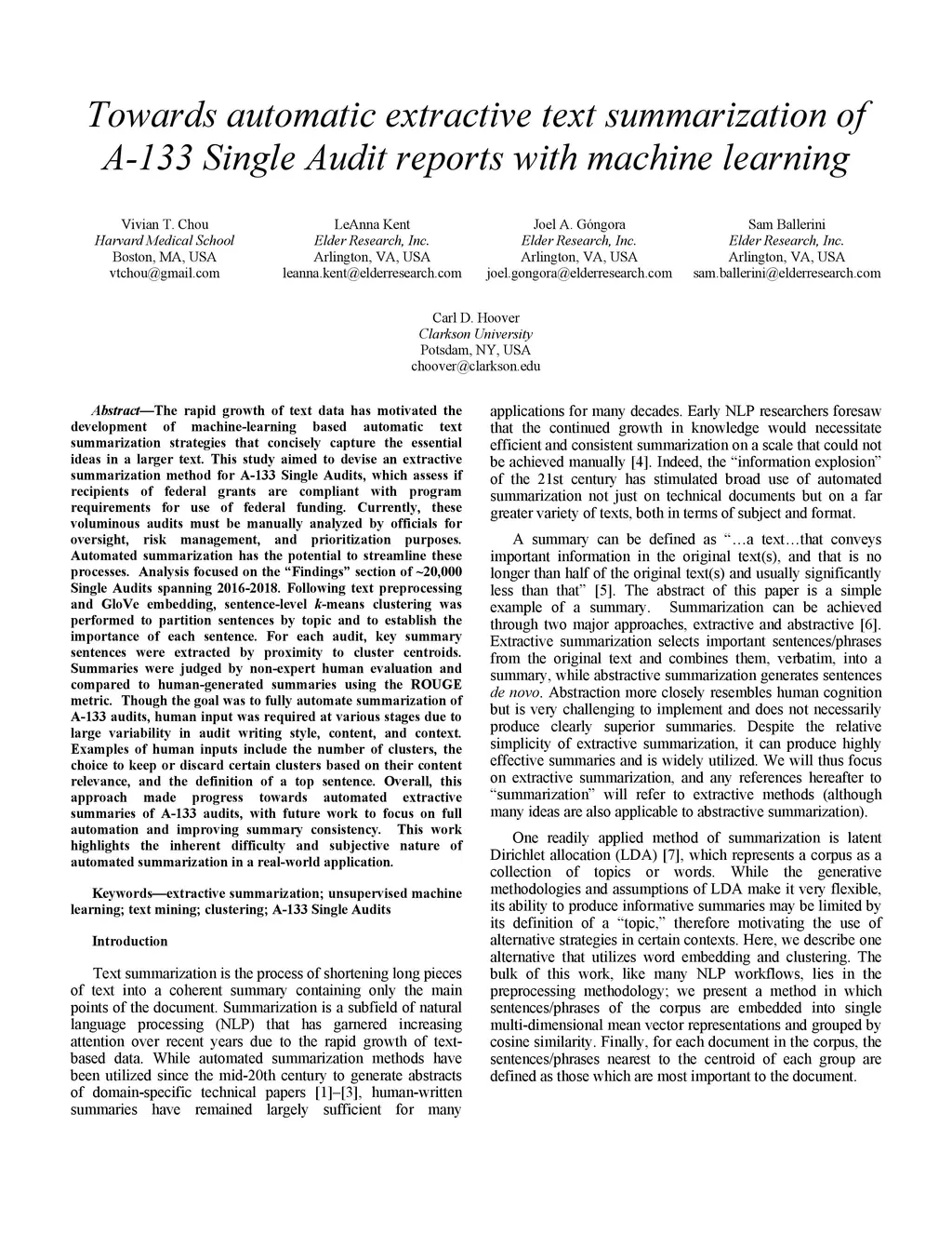 The rapid growth of text data has motivated the development of machine-learning based automatic text summarization strategies that concisely capture the essential ideas in a larger text. This study aimed to devise an extractive summarization method for A-133 Single Audits, which assess if recipients of federal grants are compliant with program requirements for use of federal funding. Currently, these voluminous audits must be manually analyzed by officials for oversight, risk management, and prioritization purposes. Automated summarization has the potential to streamline these processes. Analysis focused on the "Findings" section of ~20,000 Single Audits spanning 2016-2018. Following text preprocessing and GloVe embedding, sentence-level k-means clustering was performed to partition sentences by topic and to establish the importance of each sentence. For each audit, key summary sentences were extracted by proximity to cluster centroids. Summaries were judged by non-expert human evaluation and compared to human-generated summaries using the ROUGE metric. Though the goal was to fully automate summarization of A-133 audits, human input was required at various stages due to large variability in audit writing style, content, and context. Examples of human inputs include the number of clusters, the choice to keep or discard certain clusters based on their content relevance, and the definition of a top sentence. Overall, this approach made progress towards automated extractive summaries of A-133 audits, with future work to focus on full automation and improving summary consistency. This work highlights the inherent difficulty and subjective nature of automated summarization in a real-world application.