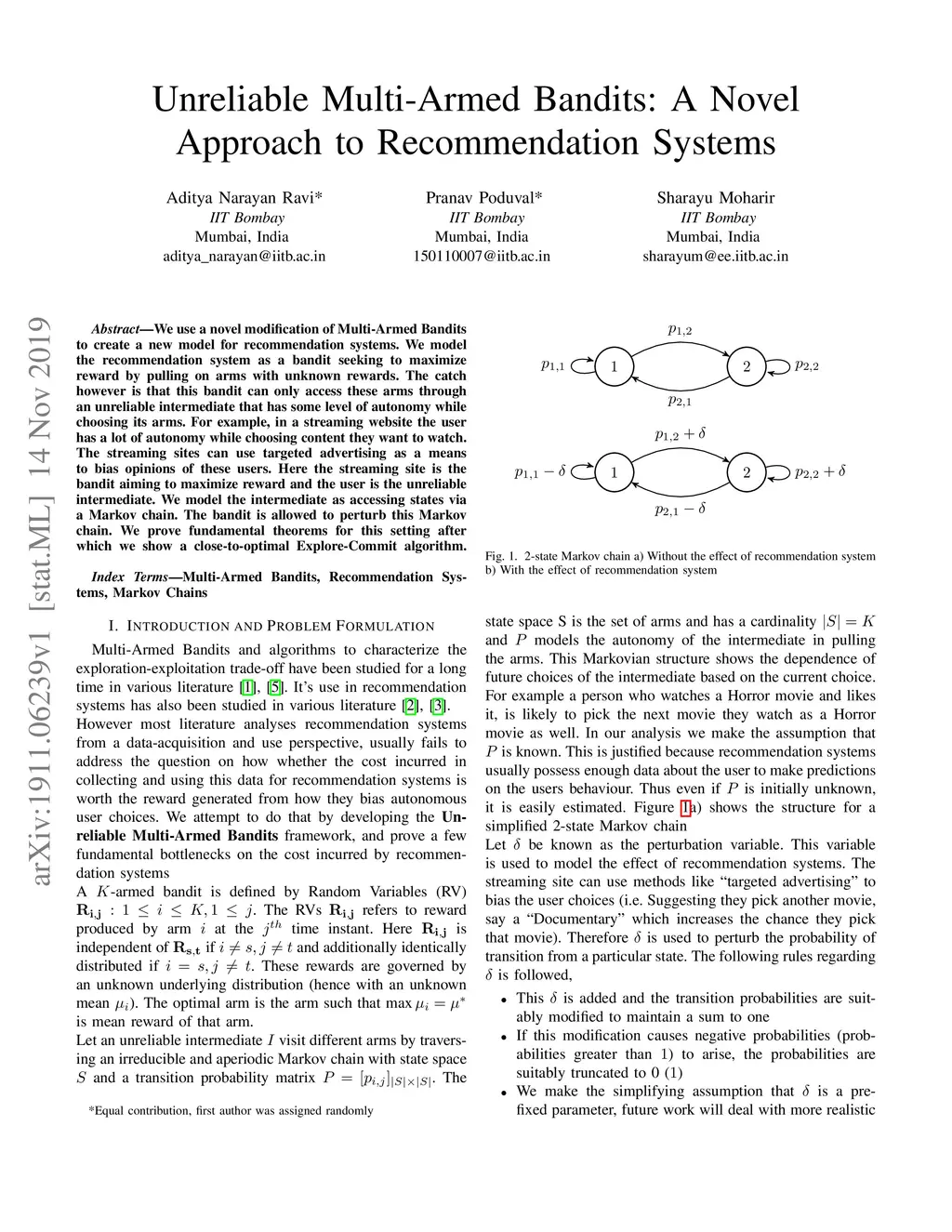 We use a novel modification of Multi-Armed Bandits to create a new model for recommendation systems. We model the recommendation system as a bandit seeking to maximize reward by pulling on arms with unknown rewards. The catch however is that this bandit can only access these arms through an unreliable intermediate that has some level of autonomy while choosing its arms. For example, in a streaming website the user has a lot of autonomy while choosing content they want to watch. The streaming sites can use targeted advertising as a means to bias opinions of these users. Here the streaming site is the bandit aiming to maximize reward and the user is the unreliable intermediate. We model the intermediate as accessing states via a Markov chain. The bandit is allowed to perturb this Markov chain. We prove fundamental theorems for this setting after which we show a close-to-optimal Explore-Commit algorithm.