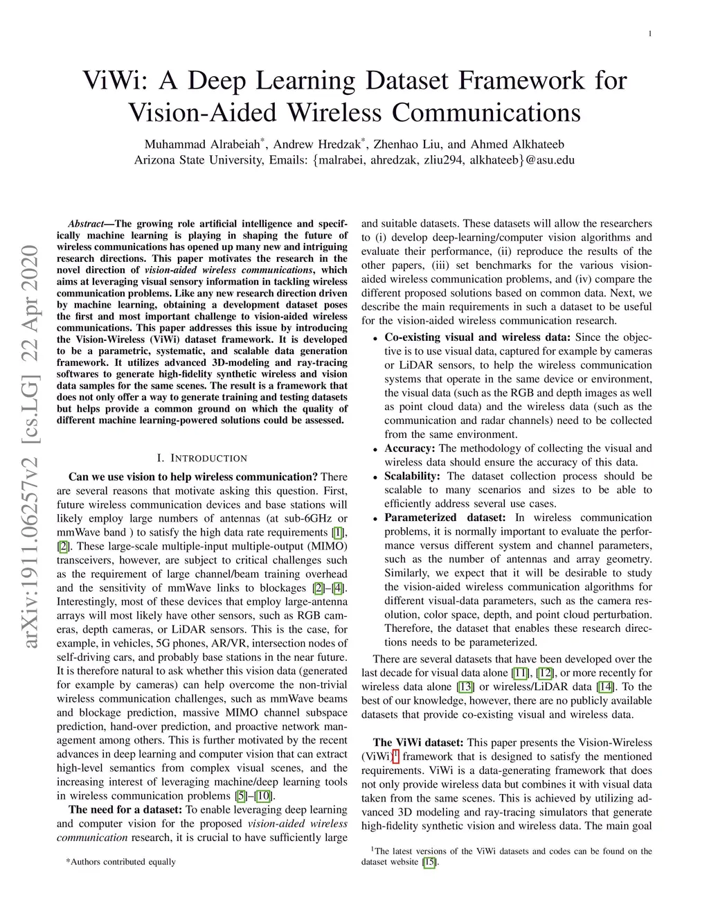 The growing role that artificial intelligence and specifically machine learning is playing in shaping the future of wireless communications has opened up many new and intriguing research directions. This paper motivates the research in the novel direction of \textit{vision-aided wireless communications}, which aims at leveraging visual sensory information in tackling wireless communication problems. Like any new research direction driven by machine learning, obtaining a development dataset poses the first and most important challenge to vision-aided wireless communications. This paper addresses this issue by introducing the Vision-Wireless (ViWi) dataset framework. It is developed to be a parametric, systematic, and scalable data generation framework. It utilizes advanced 3D-modeling and ray-tracing softwares to generate high-fidelity synthetic wireless and vision data samples for the same scenes. The result is a framework that does not only offer a way to generate training and testing datasets but helps provide a common ground on which the quality of different machine learning-powered solutions could be assessed.
