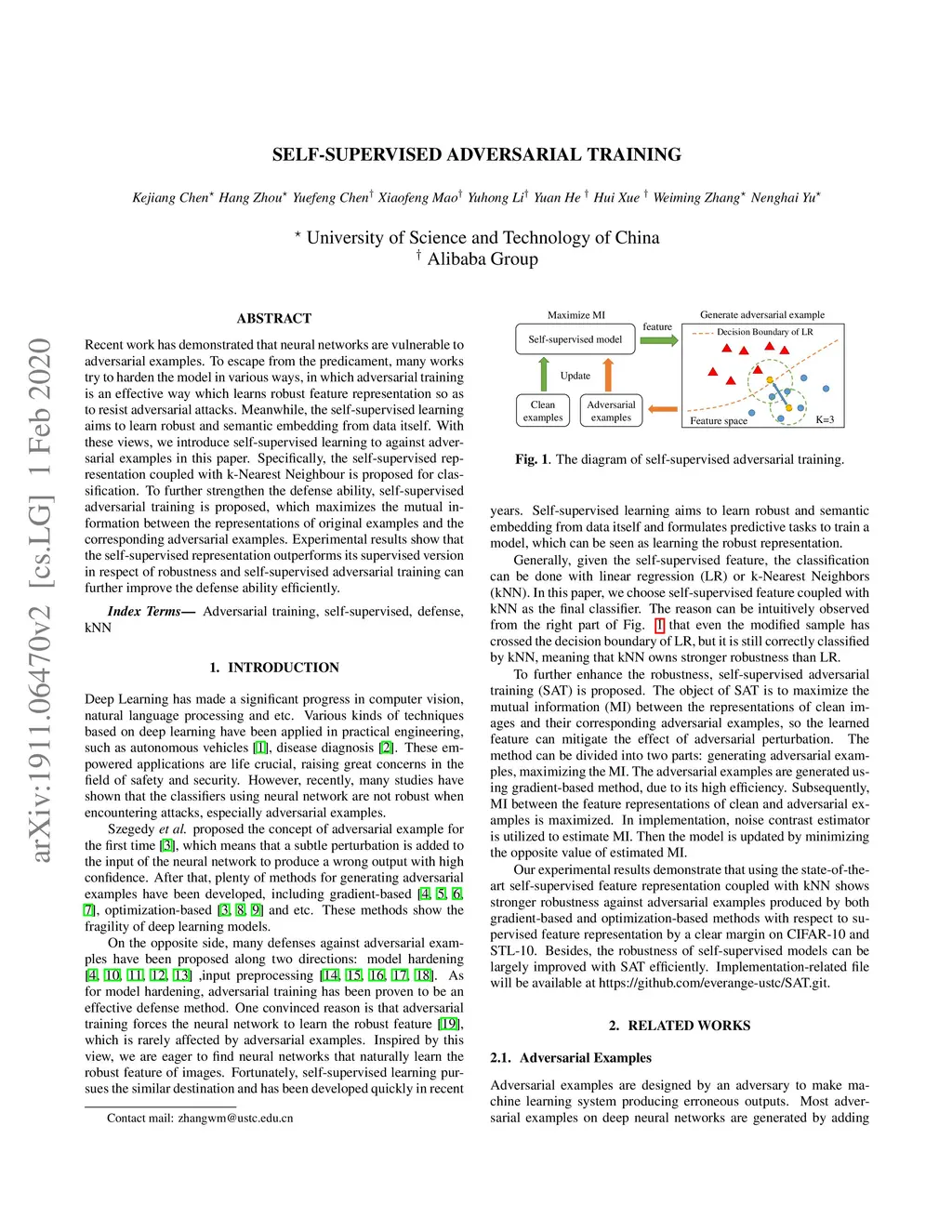 Recent work has demonstrated that neural networks are vulnerable to adversarial examples. To escape from the predicament, many works try to harden the model in various ways, in which adversarial training is an effective way which learns robust feature representation so as to resist adversarial attacks. Meanwhile, the self-supervised learning aims to learn robust and semantic embedding from data itself. With these views, we introduce self-supervised learning to against adversarial examples in this paper. Specifically, the self-supervised representation coupled with k-Nearest Neighbour is proposed for classification. To further strengthen the defense ability, self-supervised adversarial training is proposed, which maximizes the mutual information between the representations of original examples and the corresponding adversarial examples. Experimental results show that the self-supervised representation outperforms its supervised version in respect of robustness and self-supervised adversarial training can further improve the defense ability efficiently.