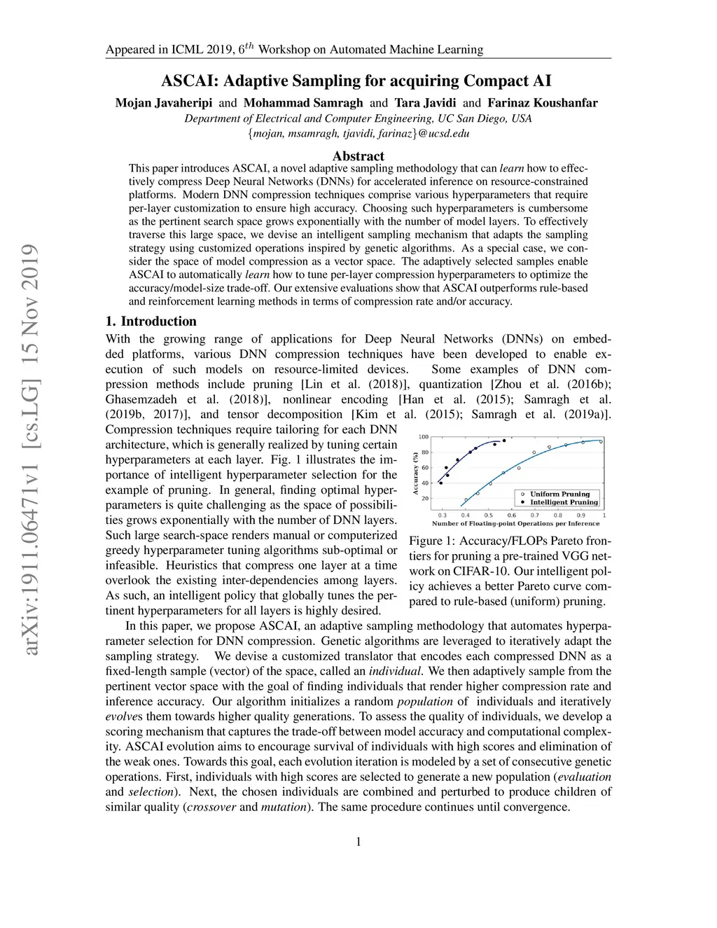 This paper introduces ASCAI, a novel adaptive sampling methodology that can learn how to effectively compress Deep Neural Networks (DNNs) for accelerated inference on resource-constrained platforms. Modern DNN compression techniques comprise various hyperparameters that require per-layer customization to ensure high accuracy. Choosing such hyperparameters is cumbersome as the pertinent search space grows exponentially with the number of model layers. To effectively traverse this large space, we devise an intelligent sampling mechanism that adapts the sampling strategy using customized operations inspired by genetic algorithms. As a special case, we consider the space of model compression as a vector space. The adaptively selected samples enable ASCAI to automatically learn how to tune per-layer compression hyperparameters to optimize the accuracy/model-size trade-off. Our extensive evaluations show that ASCAI outperforms rule-based and reinforcement learning methods in terms of compression rate and/or accuracy