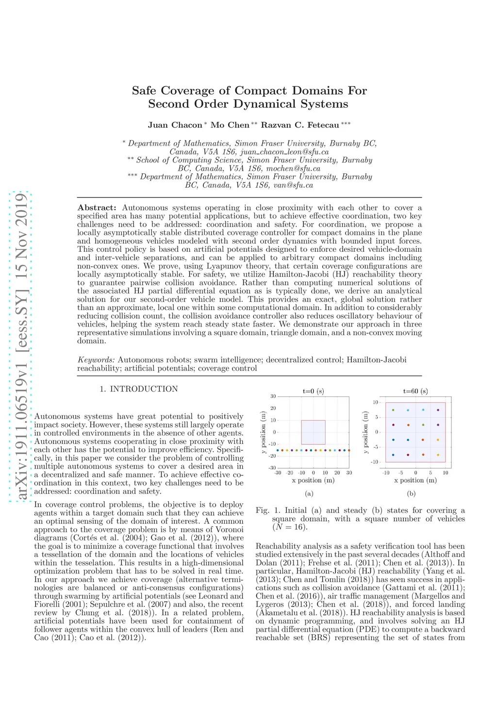 Autonomous systems operating in close proximity with each other to cover a specified area has many potential applications, but to achieve effective coordination, two key challenges need to be addressed: coordination and safety. For coordination, we propose a locally asymptotically stable distributed coverage controller for compact domains in the plane and homogeneous vehicles modeled with second order dynamics with bounded input forces. This control policy is based on artificial potentials designed to enforce desired vehicle-domain and inter-vehicle separations, and can be applied to arbitrary compact domains including non-convex ones. We prove, using Lyapunov theory, that certain coverage configurations are locally asymptotically stable. For safety, we utilize Hamilton-Jacobi (HJ) reachability theory to guarantee pairwise collision avoidance. Rather than computing numerical solutions of the associated HJ partial differential equation as is typically done, we derive an analytical solution for our second-order vehicle model. This provides an exact, global solution rather than an approximate, local one within some computational domain. In addition to considerably reducing collision count, the collision avoidance controller also reduces oscillatory behaviour of vehicles, helping the system reach steady state faster. We demonstrate our approach in three representative simulations involving a square domain, triangle domain, and a non-convex moving domain.
