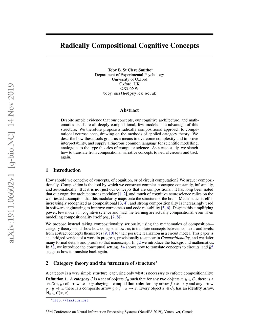 Despite ample evidence that our concepts, our cognitive architecture, and mathematics itself are all deeply compositional, few models take advantage of this structure. We therefore propose a radically compositional approach to computational neuroscience, drawing on the methods of applied category theory. We describe how these tools grant us a means to overcome complexity and improve interpretability, and supply a rigorous common language for scientific modelling, analogous to the type theories of computer science. As a case study, we sketch how to translate from compositional narrative concepts to neural circuits and back again.