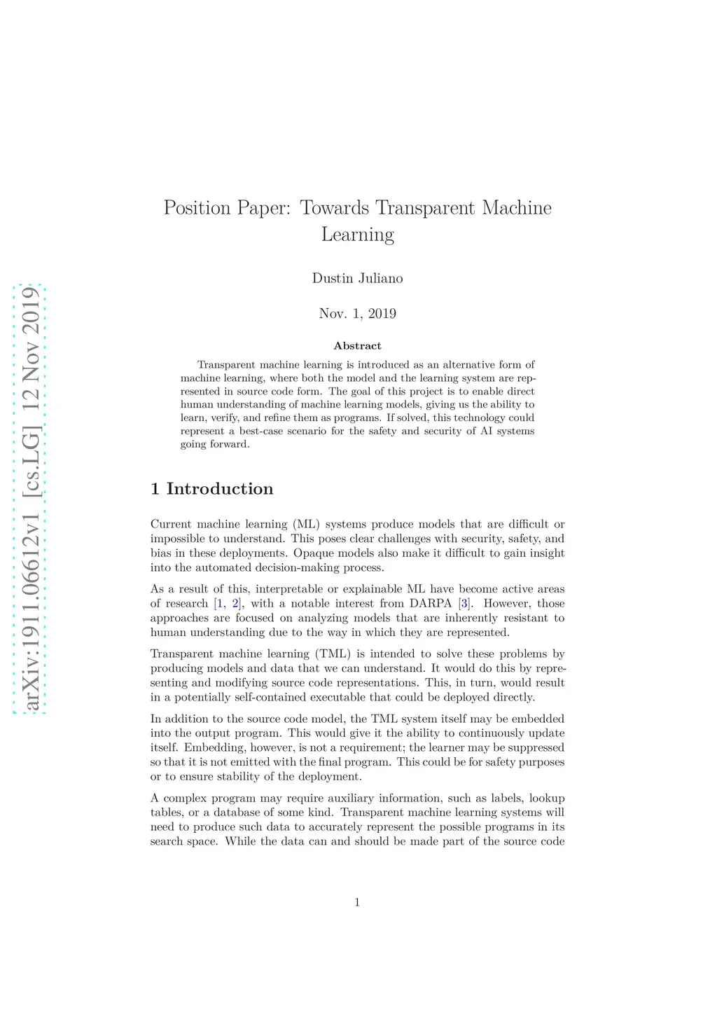 Transparent machine learning is introduced as an alternative form of machine learning, where both the model and the learning system are represented in source code form. The goal of this project is to enable direct human understanding of machine learning models, giving us the ability to learn, verify, and refine them as programs. If solved, this technology could represent a best-case scenario for the safety and security of AI systems going forward.