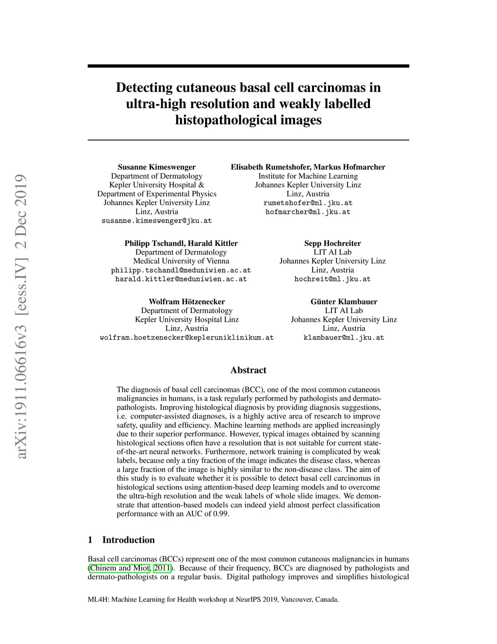 Diagnosing basal cell carcinomas (BCC), one of the most common cutaneous malignancies in humans, is a task regularly performed by pathologists and dermato-pathologists. Improving histological diagnosis by providing diagnosis suggestions, i.e. computer-assisted diagnoses is actively researched to improve safety, quality and efficiency. Increasingly, machine learning methods are applied due to their superior performance. However, typical images obtained by scanning histological sections often have a resolution that is prohibitive for processing with current state-of-the-art neural networks. Furthermore, the data pose a problem of weak labels, since only a tiny fraction of the image is indicative of the disease class, whereas a large fraction of the image is highly similar to the non-disease class. The aim of this study is to evaluate whether it is possible to detect basal cell carcinomas in histological sections using attention-based deep learning models and to overcome the ultra-high resolution and the weak labels of whole slide images. We demonstrate that attention-based models can indeed yield almost perfect classification performance with an AUC of 0.99.