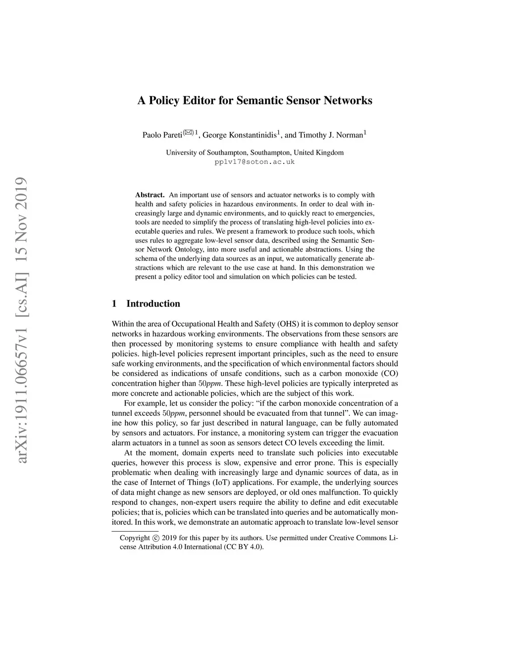 An important use of sensors and actuator networks is to comply with health and safety policies in hazardous environments. In order to deal with increasingly large and dynamic environments, and to quickly react to emergencies, tools are needed to simplify the process of translating high-level policies into executable queries and rules. We present a framework to produce such tools, which uses rules to aggregate low-level sensor data, described using the Semantic Sensor Network Ontology, into more useful and actionable abstractions. Using the schema of the underlying data sources as an input, we automatically generate abstractions which are relevant to the use case at hand. In this demonstration we present a policy editor tool and a simulation on which policies can be tested.