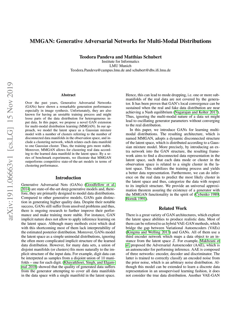 Over the past years, Generative Adversarial Networks (GANs) have shown a remarkable generation performance especially in image synthesis. Unfortunately, they are also known for having an unstable training process and might loose parts of the data distribution for heterogeneous input data. In this paper, we propose a novel GAN extension for multi-modal distribution learning (MMGAN). In our approach, we model the latent space as a Gaussian mixture model with a number of clusters referring to the number of disconnected data manifolds in the observation space, and include a clustering network, which relates each data manifold to one Gaussian cluster. Thus, the training gets more stable. Moreover, MMGAN allows for clustering real data according to the learned data manifold in the latent space. By a series of benchmark experiments, we illustrate that MMGAN outperforms competitive state-of-the-art models in terms of clustering performance.