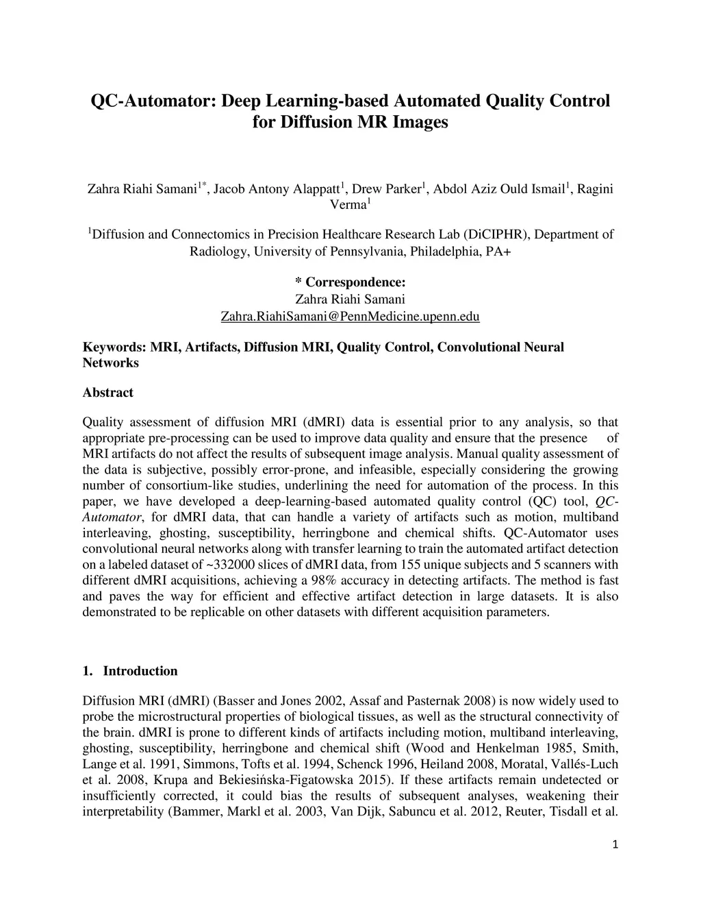 Quality assessment of diffusion MRI (dMRI) data is essential prior to any analysis, so that appropriate pre-processing can be used to improve data quality and ensure that the presence of MRI artifacts do not affect the results of subsequent image analysis. Manual quality assessment of the data is subjective, possibly error-prone, and infeasible, especially considering the growing number of consortium-like studies, underlining the need for automation of the process. In this paper, we have developed a deep-learning-based automated quality control (QC) tool, QC-Automator, for dMRI data, that can handle a variety of artifacts such as motion, multiband interleaving, ghosting, susceptibility, herringbone and chemical shifts. QC-Automator uses convolutional neural networks along with transfer learning to train the automated artifact detection on a labeled dataset of ~332000 slices of dMRI data, from 155 unique subjects and 5 scanners with different dMRI acquisitions, achieving a 98% accuracy in detecting artifacts. The method is fast and paves the way for efficient and effective artifact detection in large datasets. It is also demonstrated to be replicable on other datasets with different acquisition parameters.