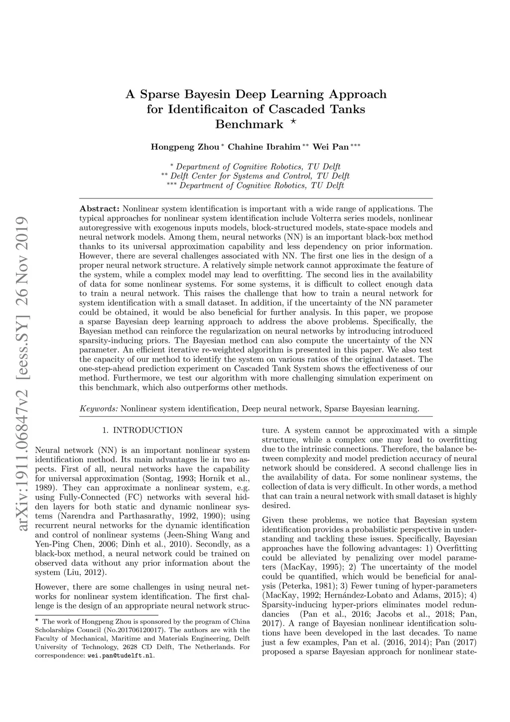 Nonlinear system identification is important with a wide range of applications. The typical approaches for nonlinear system identification include Volterra series models, nonlinear autoregressive with exogenous inputs models, block-structured models, state-space models and neural network models. Among them, neural networks (NN) is an important black-box method thanks to its universal approximation capability and less dependency on prior information. However, there are several challenges associated with NN. The first one lies in the design of a proper neural network structure. A relatively simple network cannot approximate the feature of the system, while a complex model may lead to overfitting. The second lies in the availability of data for some nonlinear systems. For some systems, it is difficult to collect enough data to train a neural network. This raises the challenge that how to train a neural network for system identification with a small dataset. In addition, if the uncertainty of the NN parameter could be obtained, it would be also beneficial for further analysis. In this paper, we propose a sparse Bayesian deep learning approach to address the above problems. Specifically, the Bayesian method can reinforce the regularization on neural networks by introducing introduced sparsity-inducing priors. The Bayesian method can also compute the uncertainty of the NN parameter. An efficient iterative re-weighted algorithm is presented in this paper. We also test the capacity of our method to identify the system on various ratios of the original dataset. The one-step-ahead prediction experiment on Cascaded Tank System shows the effectiveness of our method. Furthermore, we test our algorithm with more challenging simulation experiment on this benchmark, which also outperforms other methods.