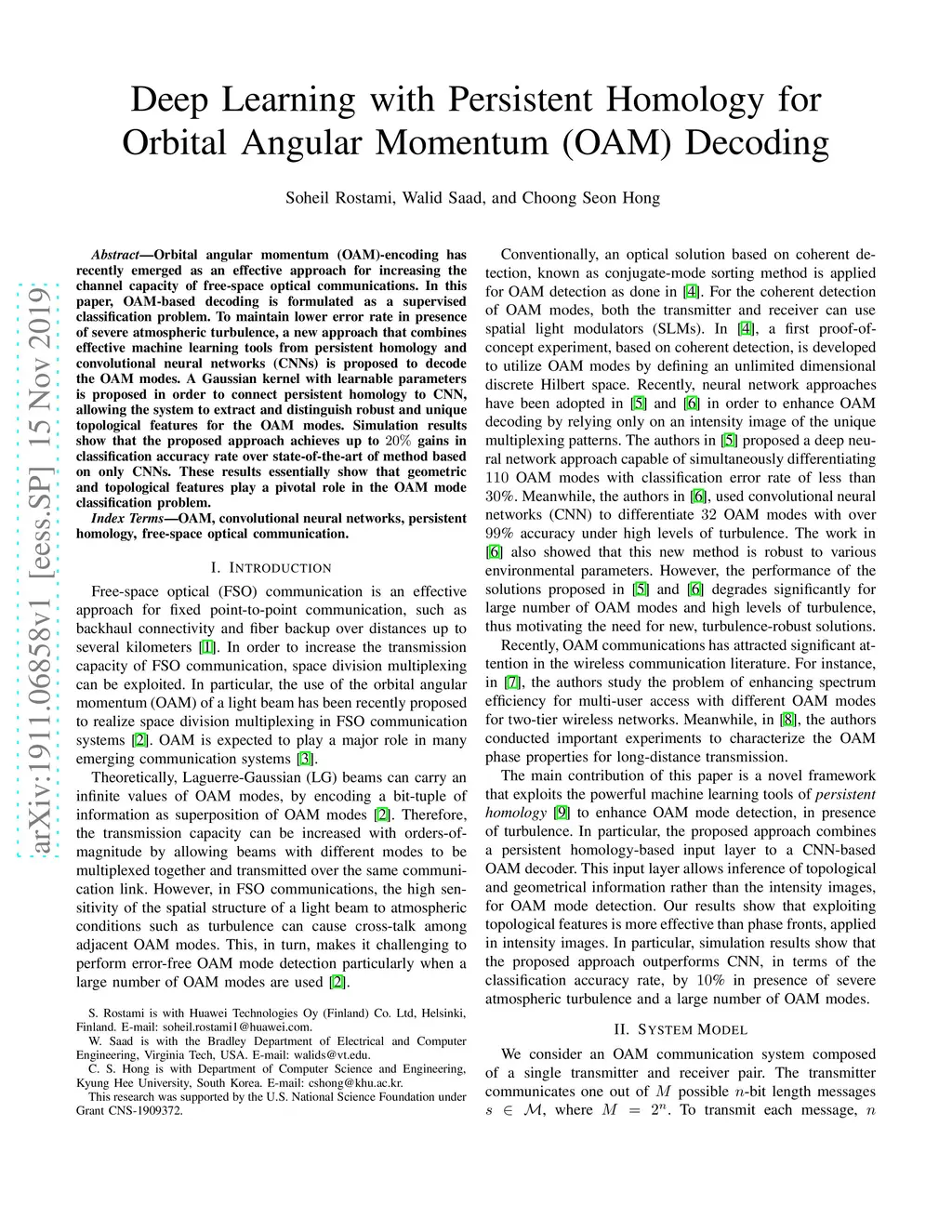 Orbital angular momentum (OAM)-encoding has recently emerged as an effective approach for increasing the channel capacity of free-space optical communications. In this paper, OAM-based decoding is formulated as a supervised classification problem. To maintain lower error rate in presence of severe atmospheric turbulence, a new approach that combines effective machine learning tools from persistent homology and convolutional neural networks (CNNs) is proposed to decode the OAM modes. A Gaussian kernel with learnable parameters is proposed in order to connect persistent homology to CNN, allowing the system to extract and distinguish robust and unique topological features for the OAM modes. Simulation results show that the proposed approach achieves up to 20% gains in classification accuracy rate over state-of-the-art of method based on only CNNs. These results essentially show that geometric and topological features play a pivotal role in the OAM mode classification problem.