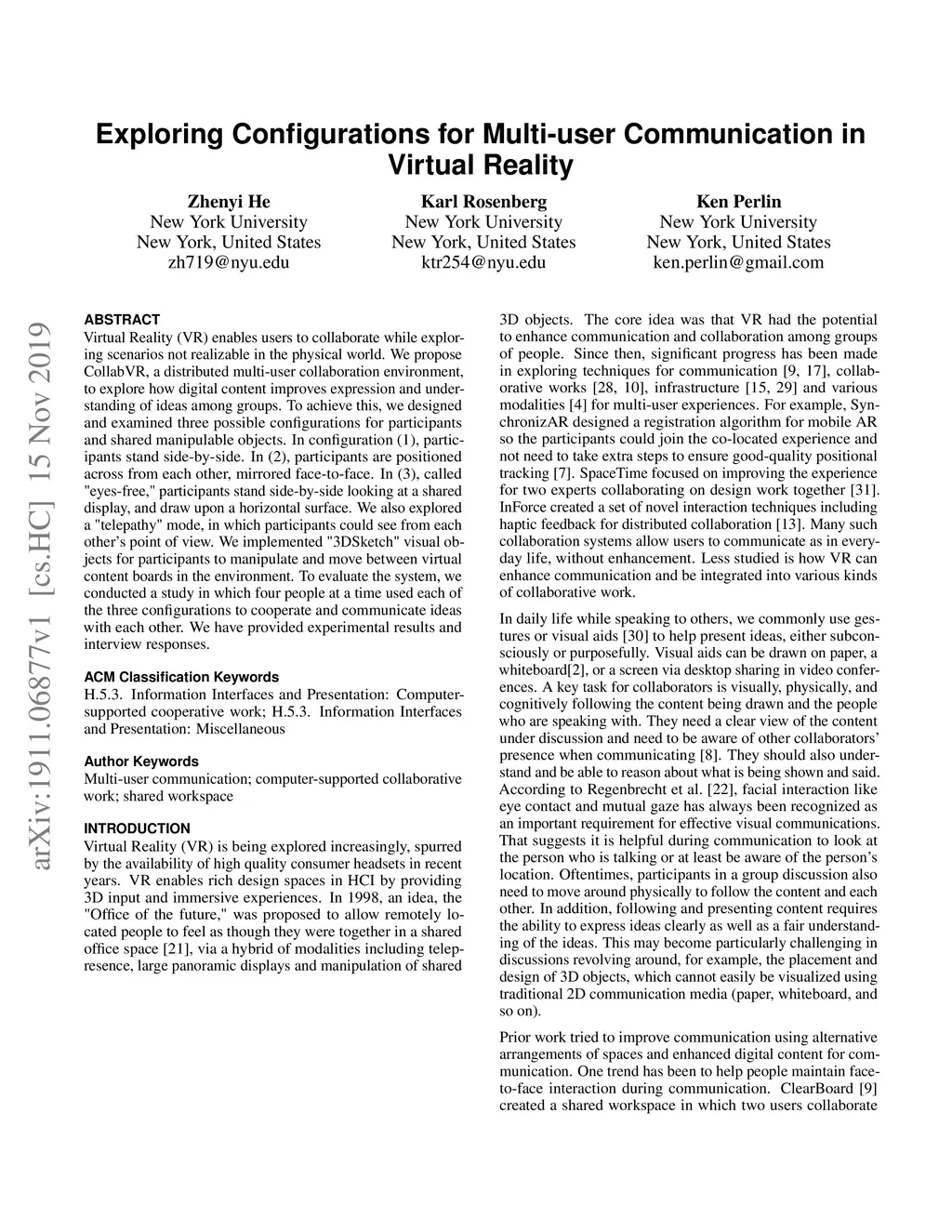 Virtual Reality (VR) enables users to collaborate while exploring scenarios not realizable in the physical world. We propose CollabVR, a distributed multi-user collaboration environment, to explore how digital content improves expression and understanding of ideas among groups. To achieve this, we designed and examined three possible configurations for participants and shared manipulable objects. In configuration (1), participants stand side-by-side. In (2), participants are positioned across from each other, mirrored face-to-face. In (3), called "eyes-free," participants stand side-by-side looking at a shared display, and draw upon a horizontal surface. We also explored a "telepathy" mode, in which participants could see from each other's point of view. We implemented "3DSketch" visual objects for participants to manipulate and move between virtual content boards in the environment. To evaluate the system, we conducted a study in which four people at a time used each of the three configurations to cooperate and communicate ideas with each other. We have provided experimental results and interview responses.