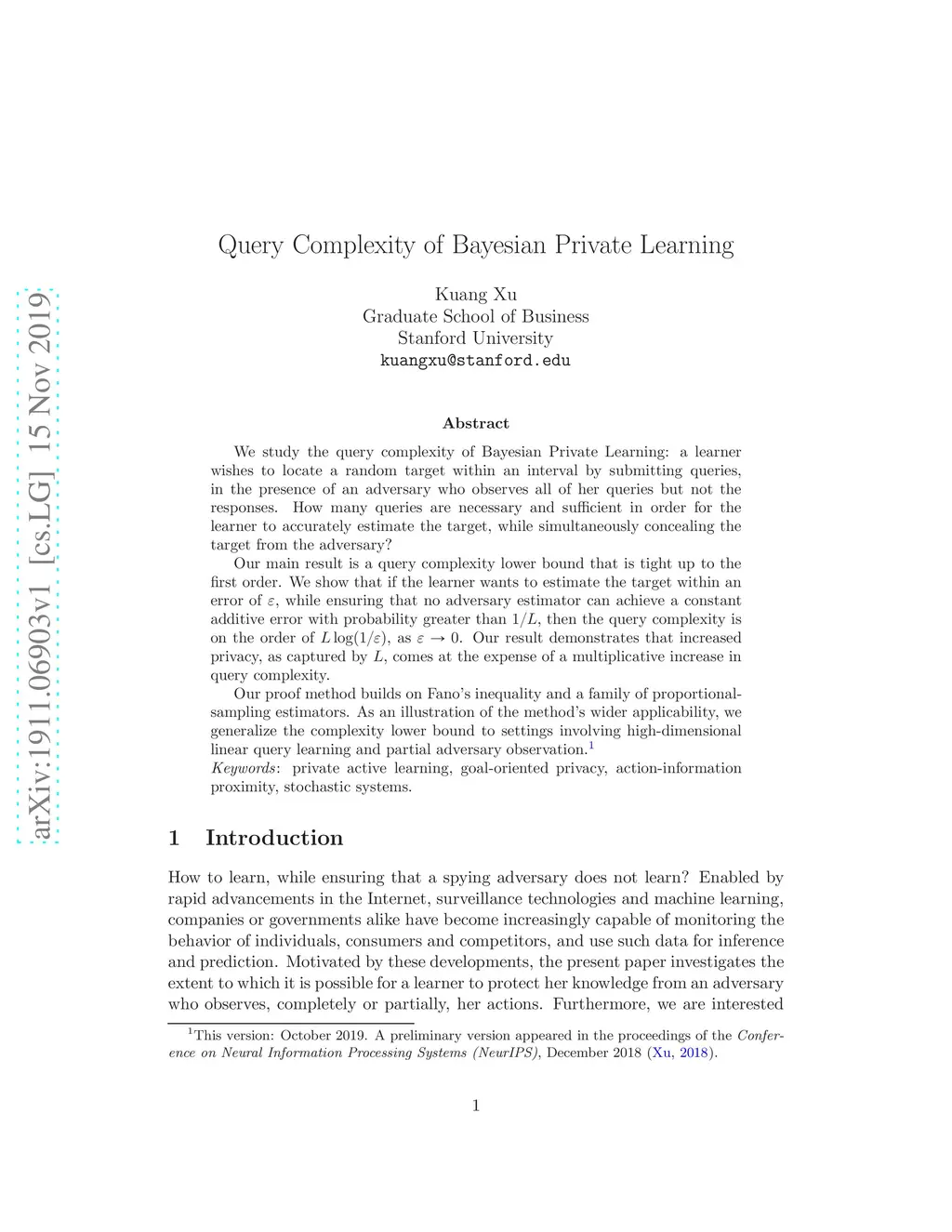 We study the query complexity of Bayesian Private Learning: a learner wishes to locate a random target within an interval by submitting queries, in the presence of an adversary who observes all of her queries but not the responses. How many queries are necessary and sufficient in order for the learner to accurately estimate the target, while simultaneously concealing the target from the adversary? Our main result is a query complexity lower bound that is tight up to the first order. We show that if the learner wants to estimate the target within an error of , while ensuring that no adversary estimator can achieve a constant additive error with probability greater than , then the query complexity is on the order of , as . Our result demonstrates that increased privacy, as captured by , comes at the expense of a {multiplicative} increase in query complexity. Our proof method builds on Fano's inequality and a family of proportional-sampling estimators. As an illustration of the method's wider applicability, we generalize the complexity lower bound to settings involving high-dimensional linear query learning and partial adversary observation.