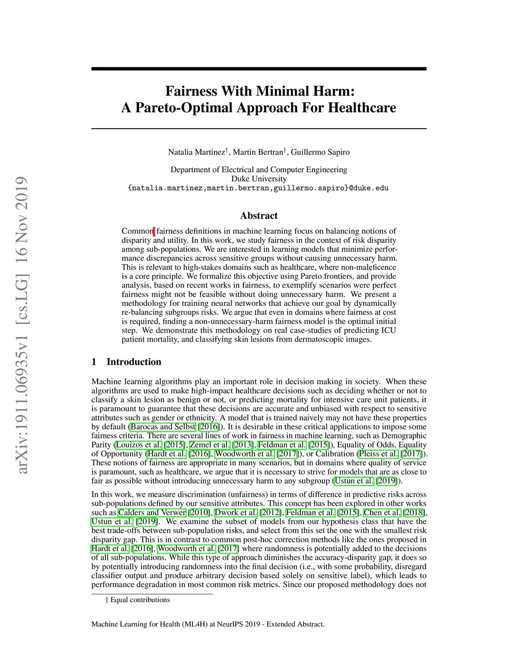 Common fairness definitions in machine learning focus on balancing notions of disparity and utility. In this work, we study fairness in the context of risk disparity among sub-populations. We are interested in learning models that minimize performance discrepancies across sensitive groups without causing unnecessary harm. This is relevant to high-stakes domains such as healthcare, where non-maleficence is a core principle. We formalize this objective using Pareto frontiers, and provide analysis, based on recent works in fairness, to exemplify scenarios were perfect fairness might not be feasible without doing unnecessary harm. We present a methodology for training neural networks that achieve our goal by dynamically re-balancing subgroups risks. We argue that even in domains where fairness at cost is required, finding a non-unnecessary-harm fairness model is the optimal initial step. We demonstrate this methodology on real case-studies of predicting ICU patient mortality, and classifying skin lesions from dermatoscopic images.