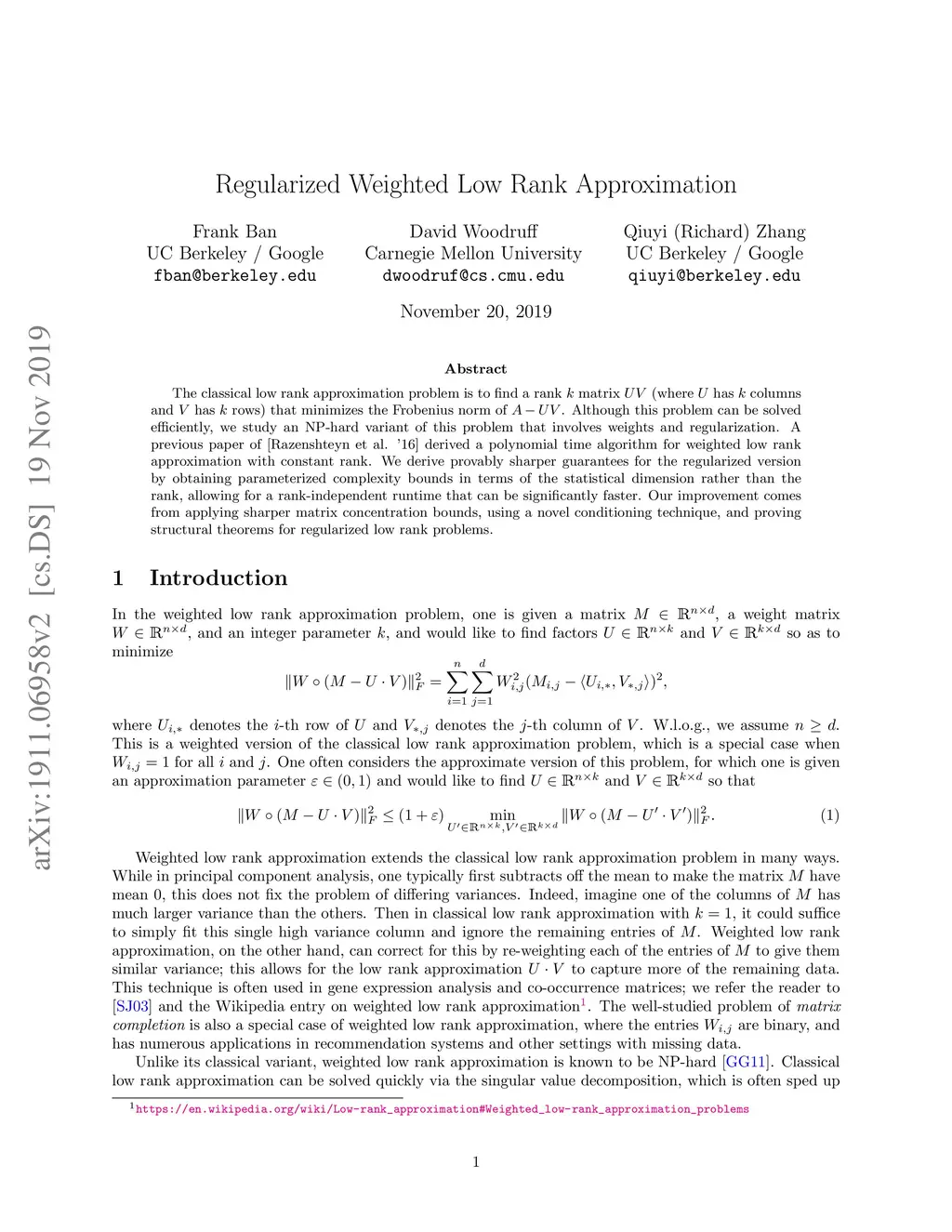 Regularized Weighted Low Rank Approximation