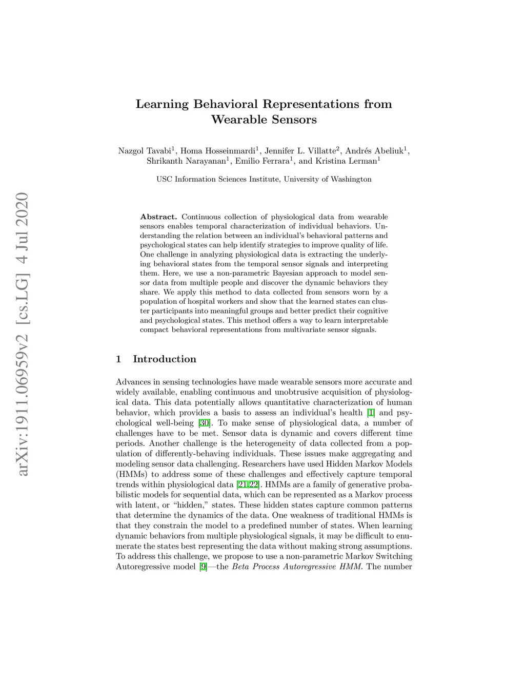 Continuous collection of physiological data from wearable sensors enables temporal characterization of individual behaviors. Understanding the relation between an individual's behavioral patterns and psychological states can help identify strategies to improve quality of life. One challenge in analyzing physiological data is extracting the underlying behavioral states from the temporal sensor signals and interpreting them. Here, we use a non-parametric Bayesian approach to model sensor data from multiple people and discover the dynamic behaviors they share. We apply this method to data collected from sensors worn by a population of hospital workers and show that the learned states can cluster participants into meaningful groups and better predict their cognitive and psychological states. This method offers a way to learn interpretable compact behavioral representations from multivariate sensor signals.