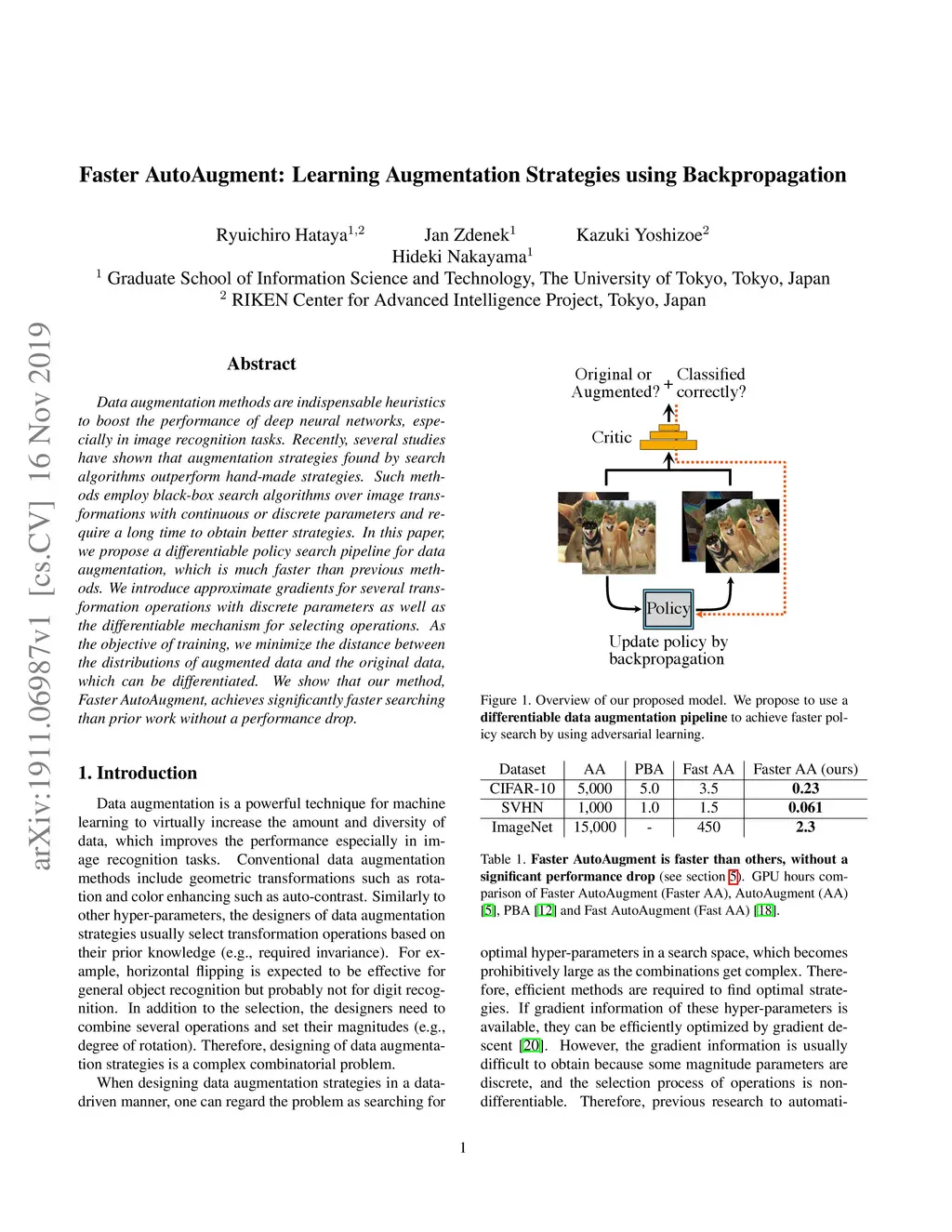 Data augmentation methods are indispensable heuristics to boost the performance of deep neural networks, especially in image recognition tasks. Recently, several studies have shown that augmentation strategies found by search algorithms outperform hand-made strategies. Such methods employ black-box search algorithms over image transformations with continuous or discrete parameters and require a long time to obtain better strategies. In this paper, we propose a differentiable policy search pipeline for data augmentation, which is much faster than previous methods. We introduce approximate gradients for several transformation operations with discrete parameters as well as the differentiable mechanism for selecting operations. As the objective of training, we minimize the distance between the distributions of augmented data and the original data, which can be differentiated. We show that our method, Faster AutoAugment, achieves significantly faster searching than prior work without a performance drop.
