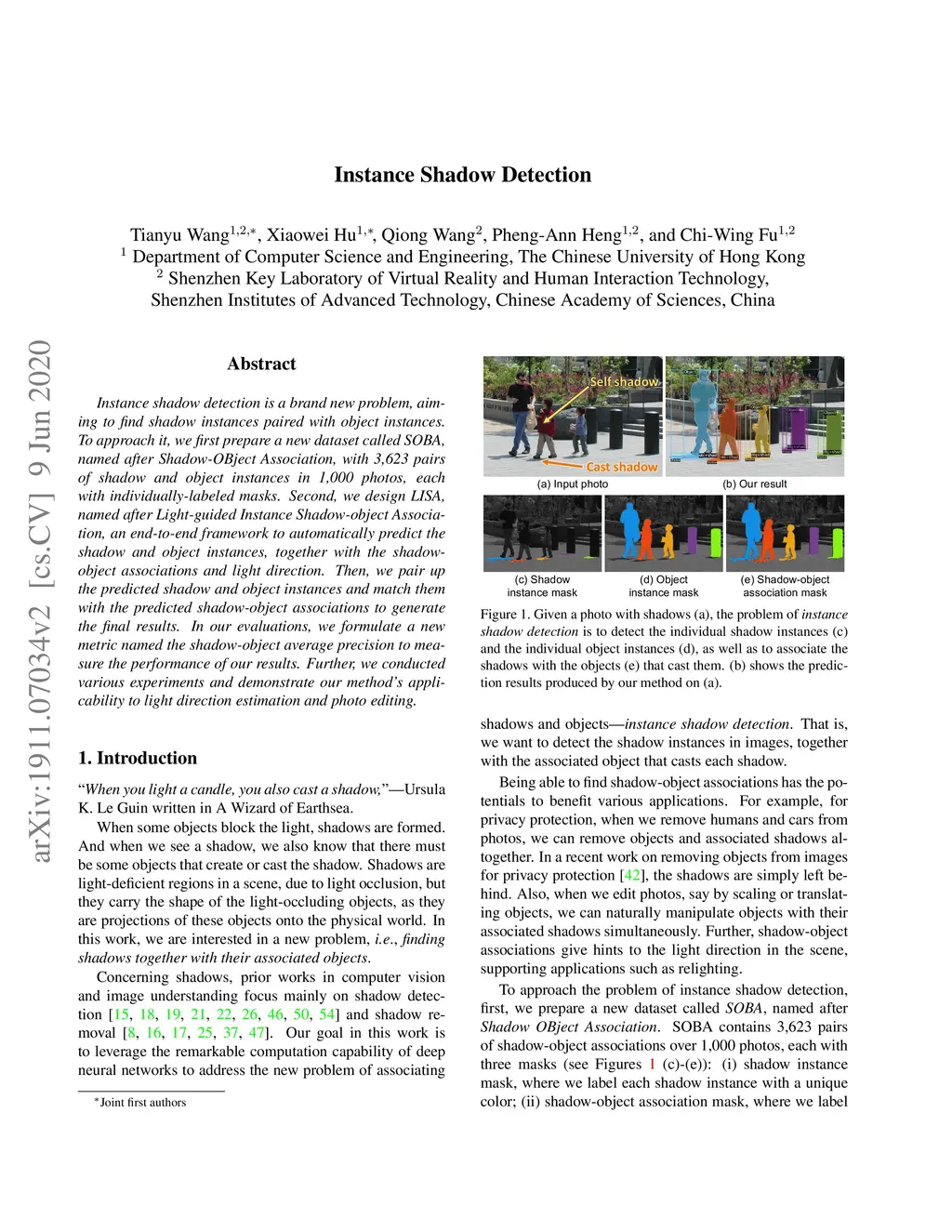 Instance shadow detection is a brand new problem, aiming to find shadow instances paired with object instances. To approach it, we first prepare a new dataset called SOBA, named after Shadow-OBject Association, with 3,623 pairs of shadow and object instances in 1,000 photos, each with individual labeled masks. Second, we design LISA, named after Light-guided Instance Shadow-object Association, an end-to-end framework to automatically predict the shadow and object instances, together with the shadow-object associations and light direction. Then, we pair up the predicted shadow and object instances, and match them with the predicted shadow-object associations to generate the final results. In our evaluations, we formulate a new metric named the shadow-object average precision to measure the performance of our results. Further, we conducted various experiments and demonstrate our method's applicability on light direction estimation and photo editing.