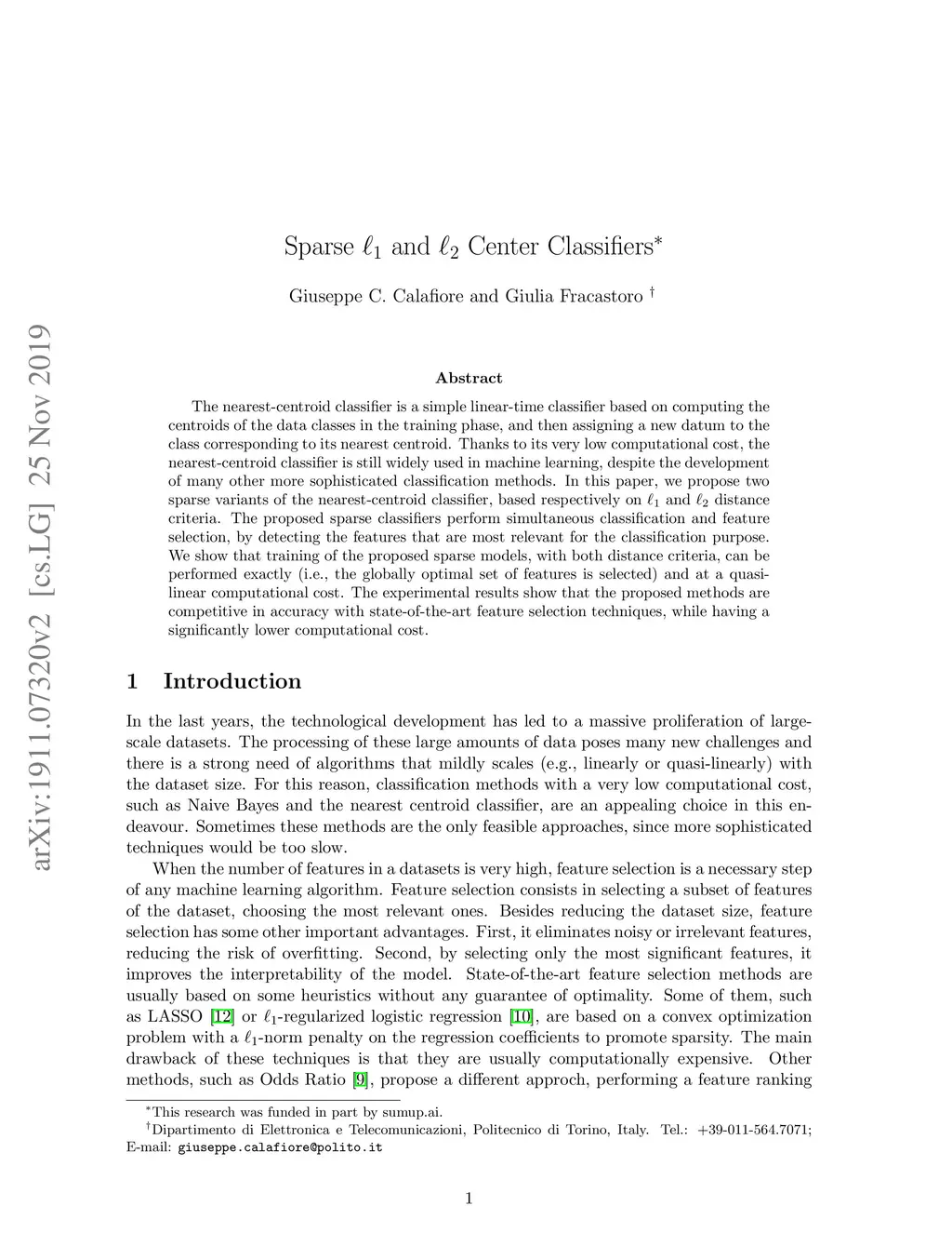 The nearest-centroid classifier is a simple linear-time classifier based on computing the centroids of the data classes in the training phase, and then assigning a new datum to the class corresponding to its nearest centroid. Thanks to its very low computational cost, the nearest-centroid classifier is still widely used in machine learning, despite the development of many other more sophisticated classification methods. In this paper, we propose two sparse variants of the nearest-centroid classifier, based respectively on and distance criteria. The proposed sparse classifiers perform simultaneous classification and feature selection, by detecting the features that are most relevant for the classification purpose. We show that training of the proposed sparse models, with both distance criteria, can be performed exactly (i.e., the globally optimal set of features is selected) and at a quasi-linear computational cost. The experimental results show that the proposed methods are competitive in accuracy with state-of-the-art feature selection techniques, while having a significantly lower computational cost.