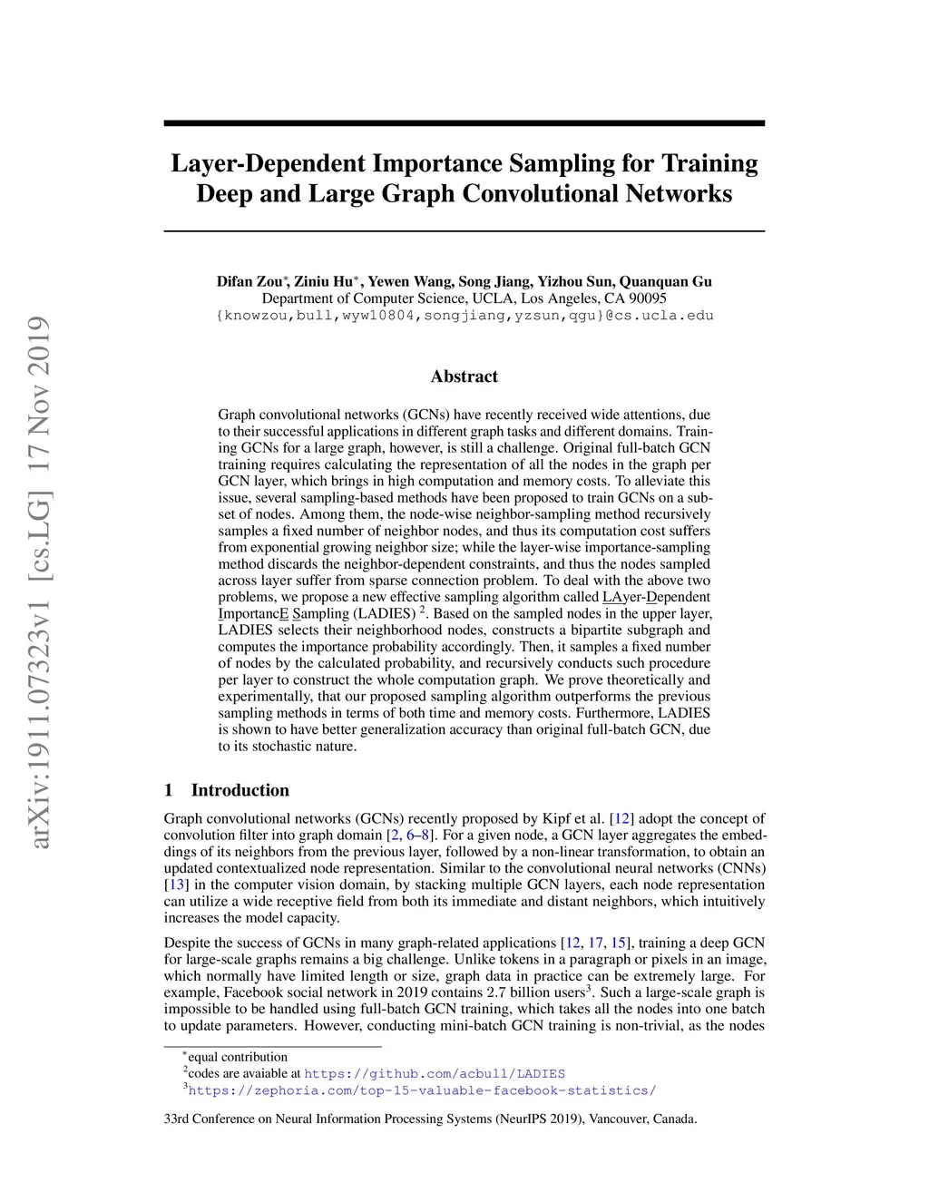 Graph convolutional networks (GCNs) have recently received wide attentions, due to their successful applications in different graph tasks and different domains. Training GCNs for a large graph, however, is still a challenge. Original full-batch GCN training requires calculating the representation of all the nodes in the graph per GCN layer, which brings in high computation and memory costs. To alleviate this issue, several sampling-based methods have been proposed to train GCNs on a subset of nodes. Among them, the node-wise neighbor-sampling method recursively samples a fixed number of neighbor nodes, and thus its computation cost suffers from exponential growing neighbor size; while the layer-wise importance-sampling method discards the neighbor-dependent constraints, and thus the nodes sampled across layer suffer from sparse connection problem. To deal with the above two problems, we propose a new effective sampling algorithm called LAyer-Dependent ImportancE Sampling (LADIES). Based on the sampled nodes in the upper layer, LADIES selects their neighborhood nodes, constructs a bipartite subgraph and computes the importance probability accordingly. Then, it samples a fixed number of nodes by the calculated probability, and recursively conducts such procedure per layer to construct the whole computation graph. We prove theoretically and experimentally, that our proposed sampling algorithm outperforms the previous sampling methods in terms of both time and memory costs. Furthermore, LADIES is shown to have better generalization accuracy than original full-batch GCN, due to its stochastic nature.
