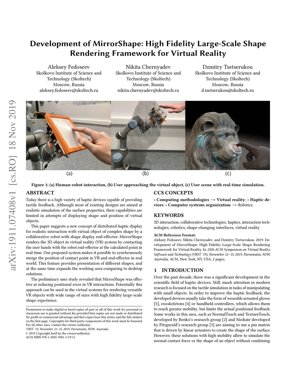 Today there is a high variety of haptic devices capable of providing tactile feedback. Although most of existing designs are aimed at realistic simulation of the surface properties, their capabilities are limited in attempts of displaying shape and position of virtual objects. This paper suggests a new concept of distributed haptic display for realistic interaction with virtual object of complex shape by a collaborative robot with shape display end-effector. MirrorShape renders the 3D object in virtual reality (VR) system by contacting the user hands with the robot end-effector at the calculated point in real-time. Our proposed system makes it possible to synchronously merge the position of contact point in VR and end-effector in real world. This feature provides presentation of different shapes, and at the same time expands the working area comparing to desktop solutions. The preliminary user study revealed that MirrorShape was effective at reducing positional error in VR interactions. Potentially this approach can be used in the virtual systems for rendering versatile VR objects with wide range of sizes with high fidelity large-scaleshape experience.
