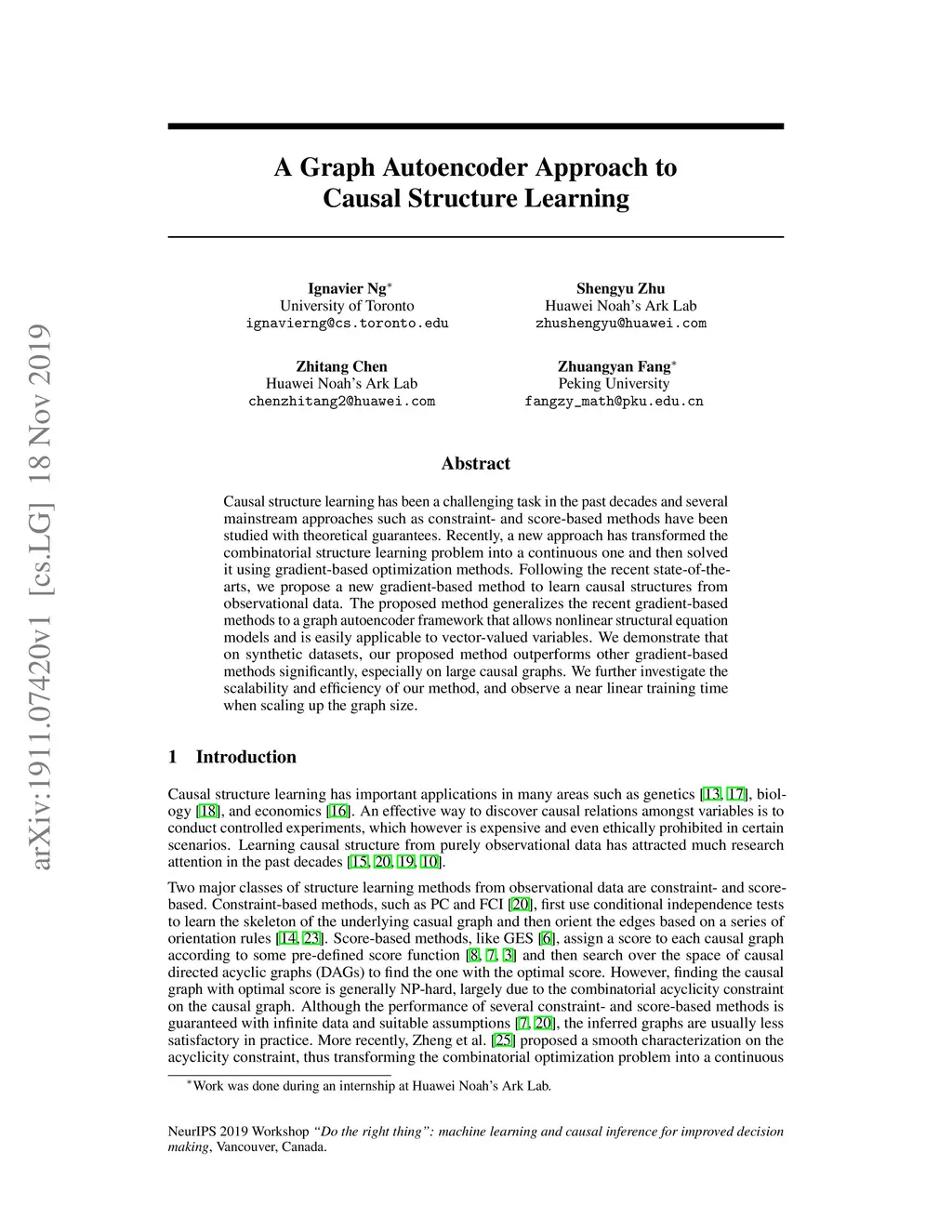 Causal structure learning has been a challenging task in the past decades and several mainstream approaches such as constraint- and score-based methods have been studied with theoretical guarantees. Recently, a new approach has transformed the combinatorial structure learning problem into a continuous one and then solved it using gradient-based optimization methods. Following the recent state-of-the-arts, we propose a new gradient-based method to learn causal structures from observational data. The proposed method generalizes the recent gradient-based methods to a graph autoencoder framework that allows nonlinear structural equation models and is easily applicable to vector-valued variables. We demonstrate that on synthetic datasets, our proposed method outperforms other gradient-based methods significantly, especially on large causal graphs. We further investigate the scalability and efficiency of our method, and observe a near linear training time when scaling up the graph size.
