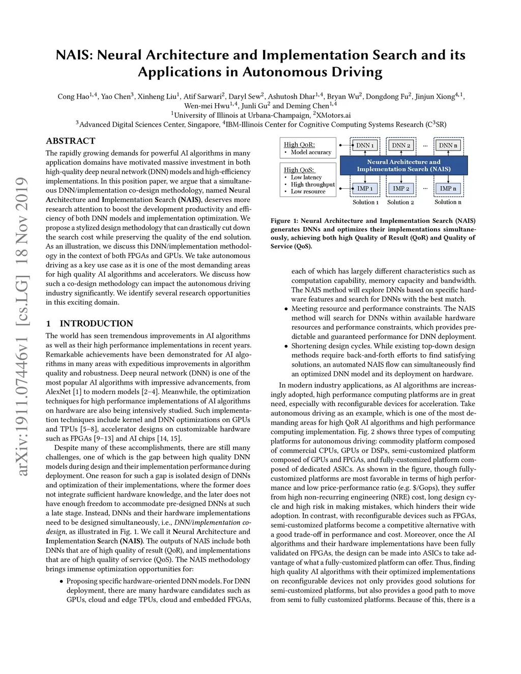 The rapidly growing demands for powerful AI algorithms in many application domains have motivated massive investment in both high-quality deep neural network (DNN) models and high-efficiency implementations. In this position paper, we argue that a simultaneous DNN/implementation co-design methodology, named Neural Architecture and Implementation Search (NAIS), deserves more research attention to boost the development productivity and efficiency of both DNN models and implementation optimization. We propose a stylized design methodology that can drastically cut down the search cost while preserving the quality of the end solution.As an illustration, we discuss this DNN/implementation methodology in the context of both FPGAs and GPUs. We take autonomous driving as a key use case as it is one of the most demanding areas for high quality AI algorithms and accelerators. We discuss how such a co-design methodology can impact the autonomous driving industry significantly. We identify several research opportunities in this exciting domain.