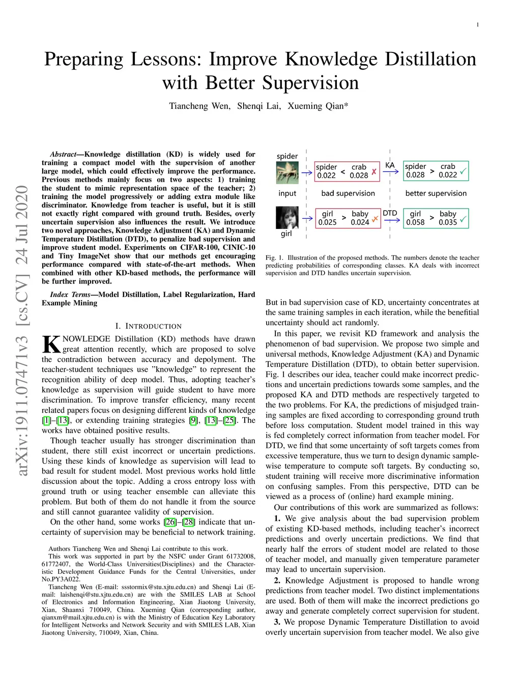 Knowledge distillation (KD) is widely used for training a compact model with the supervision of another large model, which could effectively improve the performance. Previous methods mainly focus on two aspects: 1) training the student to mimic representation space of the teacher; 2) training the model progressively or adding extra module like discriminator. Knowledge from teacher is useful, but it is still not exactly right compared with ground truth. Besides, overly uncertain supervision also influences the result. We introduce two novel approaches, Knowledge Adjustment (KA) and Dynamic Temperature Distillation (DTD), to penalize bad supervision and improve student model. Experiments on CIFAR-100, CINIC-10 and Tiny ImageNet show that our methods get encouraging performance compared with state-of-the-art methods. When combined with other KD-based methods, the performance will be further improved.