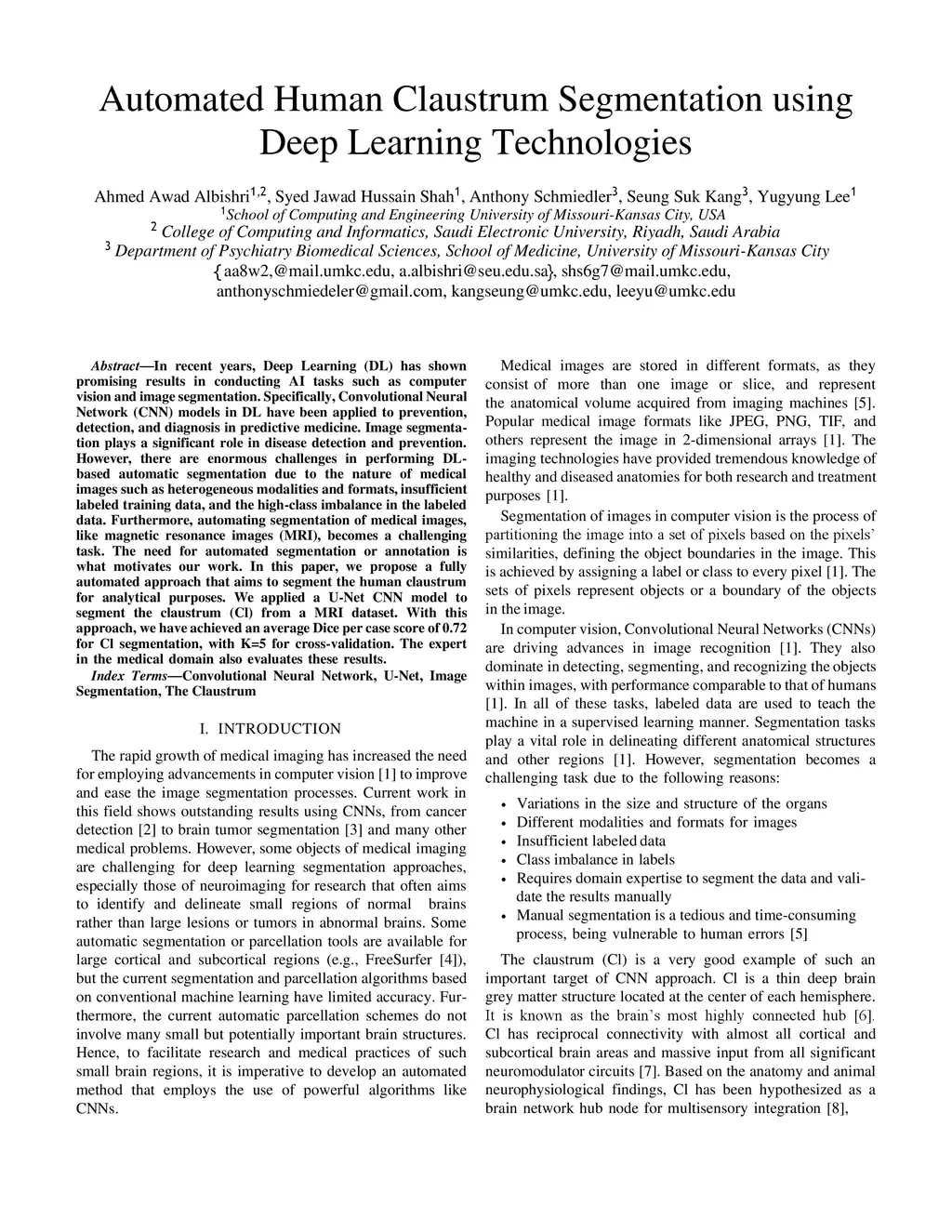 In recent years, Deep Learning (DL) has shown promising results in conducting AI tasks such as computer vision and image segmentation. Specifically, Convolutional Neural Network (CNN) models in DL have been applied to prevention,detection, and diagnosis in predictive medicine. Image segmentation plays a significant role in disease detection and prevention.However, there are enormous challenges in performing DL-based automatic segmentation due to the nature of medical images such as heterogeneous modalities and formats, insufficient labeled training data, and the high-class imbalance in the labeled data. Furthermore, automating segmentation of medical images,like magnetic resonance images (MRI), becomes a challenging task. The need for automated segmentation or annotation is what motivates our work. In this paper, we propose a fully automated approach that aims to segment the human claustrum for analytical purposes. We applied a U-Net CNN model to segment the claustrum (Cl) from a MRI dataset. With this approach, we have achieved an average Dice per case score of 0.72 for Cl segmentation, with K=5 for cross-validation. The expert in the medical domain also evaluates these results.