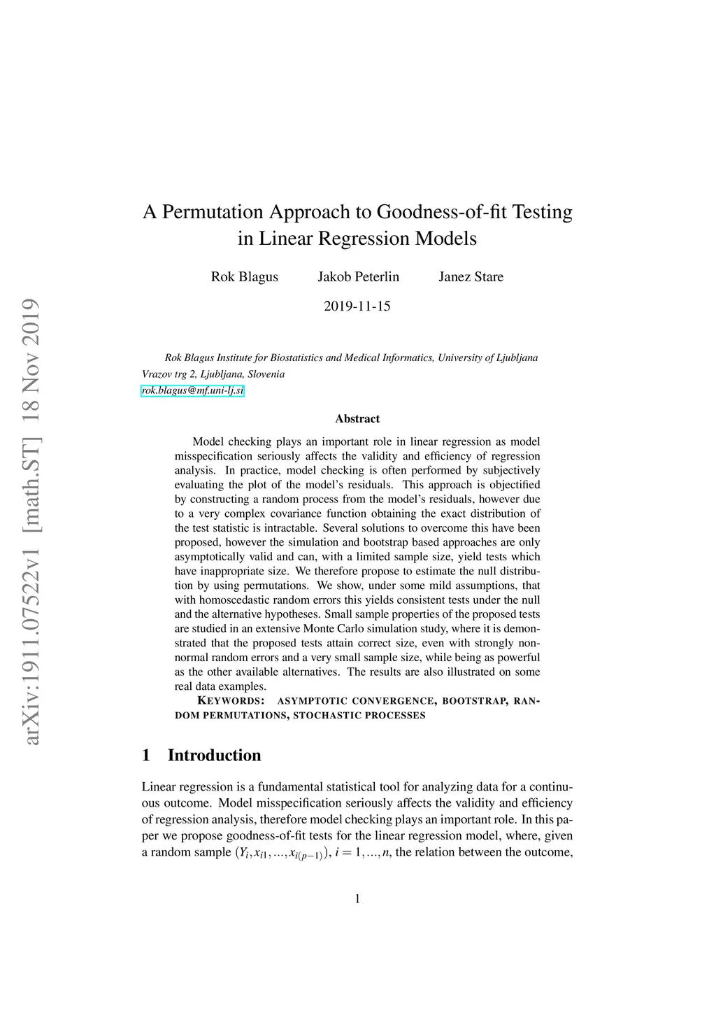 Model checking plays an important role in linear regression as model misspecification seriously affects the validity and efficiency of regression analysis. In practice, model checking is often performed by subjectively evaluating the plot of the model's residuals. This approach is objectified by constructing a random process from the model's residuals, however due to a very complex covariance function obtaining the exact distribution of the test statistic is intractable. Several solutions to overcome this have been proposed, however the simulation and bootstrap based approaches are only asymptotically valid and can, with a limited sample size, yield tests which have inappropriate size. We therefore propose to estimate the null distribution by using permutations. We show, under some mild assumptions, that with homoscedastic random errors this yields consistent tests under the null and the alternative hypotheses. Small sample properties of the proposed tests are studied in an extensive Monte Carlo simulation study, where it is demonstrated that the proposed tests attain correct size, even with strongly non-normal random errors and a very small sample size, while being as powerful as the other available alternatives. The results are also illustrated on some real data examples.
