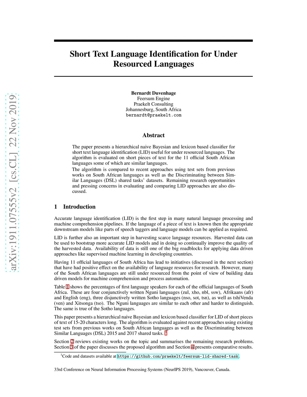 The paper presents a hierarchical naive Bayesian and lexicon based classifier for short text language identification (LID) useful for under resourced languages. The algorithm is evaluated on short pieces of text for the 11 official South African languages some of which are similar languages. The algorithm is compared to recent approaches using test sets from previous works on South African languages as well as the Discriminating between Similar Languages (DSL) shared tasks' datasets. Remaining research opportunities and pressing concerns in evaluating and comparing LID approaches are also discussed.