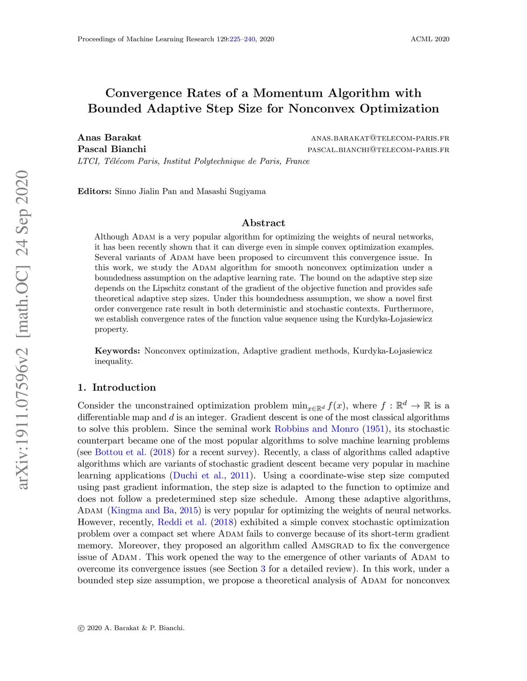 Although ADAM is a very popular algorithm for optimizing the weights of neural networks, it has been recently shown that it can diverge even in simple convex optimization examples. Several variants of ADAM have been proposed to circumvent this convergence issue. In this work, we study the ADAM algorithm for smooth nonconvex optimization under a boundedness assumption on the adaptive learning rate. The bound on the adaptive step size depends on the Lipschitz constant of the gradient of the objective function and provides safe theoretical adaptive step sizes. Under this boundedness assumption, we show a novel first order convergence rate result in both deterministic and stochastic contexts. Furthermore, we establish convergence rates of the function value sequence using the Kurdyka-Lojasiewicz property.