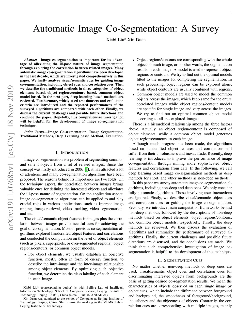 Image co-segmentation is important for its advantage of alleviating the ill-pose nature of image segmentation through exploring the correlation between related images. Many automatic image co-segmentation algorithms have been developed in the last decade, which are investigated comprehensively in this paper. We firstly analyze visual/semantic cues for guiding image co-segmentation, including object cues and correlation cues. Then we describe the traditional methods in three categories of object elements based, object regions/contours based, common object model based. In the next part, deep learning based methods are reviewed. Furthermore, widely used test datasets and evaluation criteria are introduced and the reported performances of the surveyed algorithms are compared with each other. Finally, we discuss the current challenges and possible future directions and conclude the paper. Hopefully, this comprehensive investigation will be helpful for the development of image co-segmentation technique.