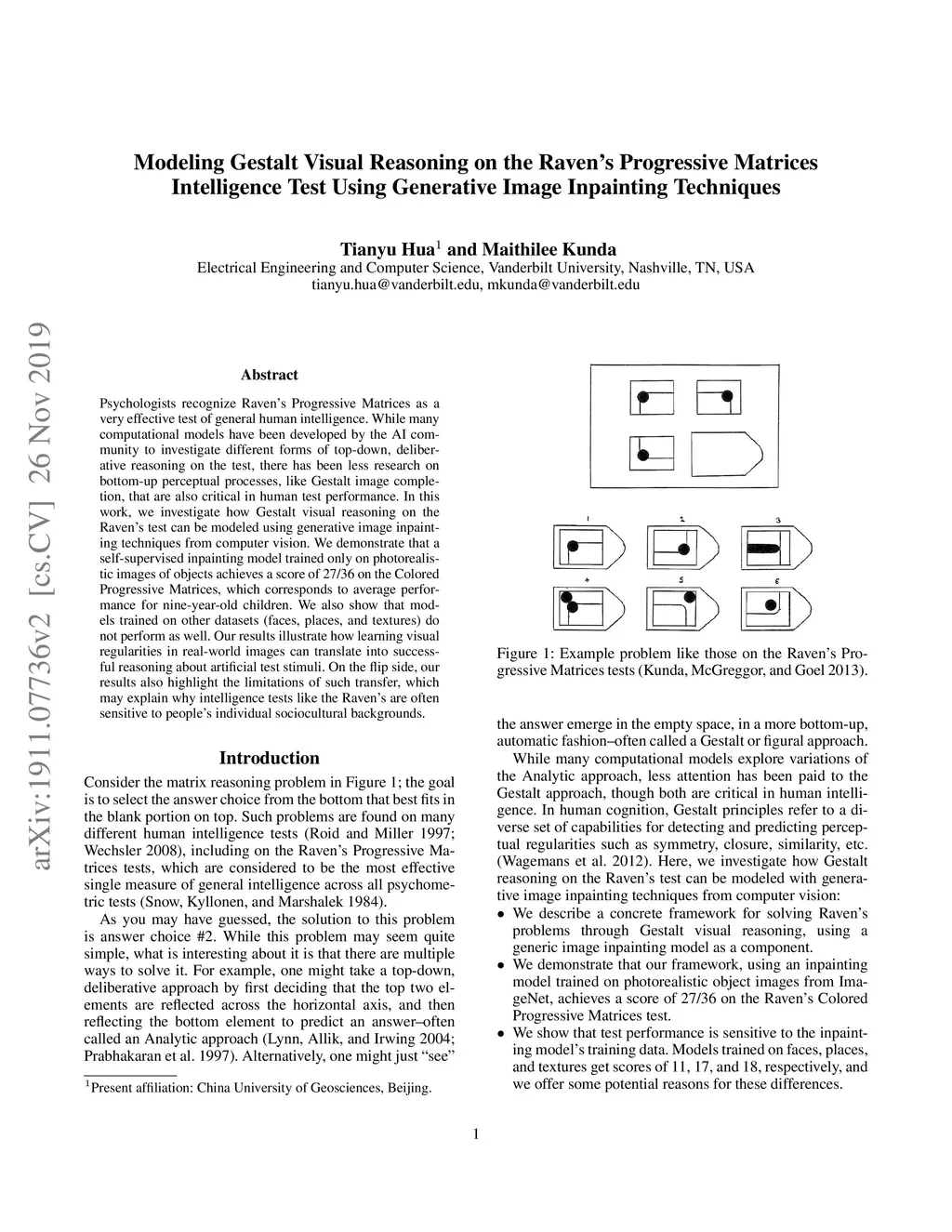 Psychologists recognize Raven's Progressive Matrices as a very effective test of general human intelligence. While many computational models have been developed by the AI community to investigate different forms of top-down, deliberative reasoning on the test, there has been less research on bottom-up perceptual processes, like Gestalt image completion, that are also critical in human test performance. In this work, we investigate how Gestalt visual reasoning on the Raven's test can be modeled using generative image inpainting techniques from computer vision. We demonstrate that a self-supervised inpainting model trained only on photorealistic images of objects achieves a score of 27/36 on the Colored Progressive Matrices, which corresponds to average performance for nine-year-old children. We also show that models trained on other datasets (faces, places, and textures) do not perform as well. Our results illustrate how learning visual regularities in real-world images can translate into successful reasoning about artificial test stimuli. On the flip side, our results also highlight the limitations of such transfer, which may explain why intelligence tests like the Raven's are often sensitive to people's individual sociocultural backgrounds.