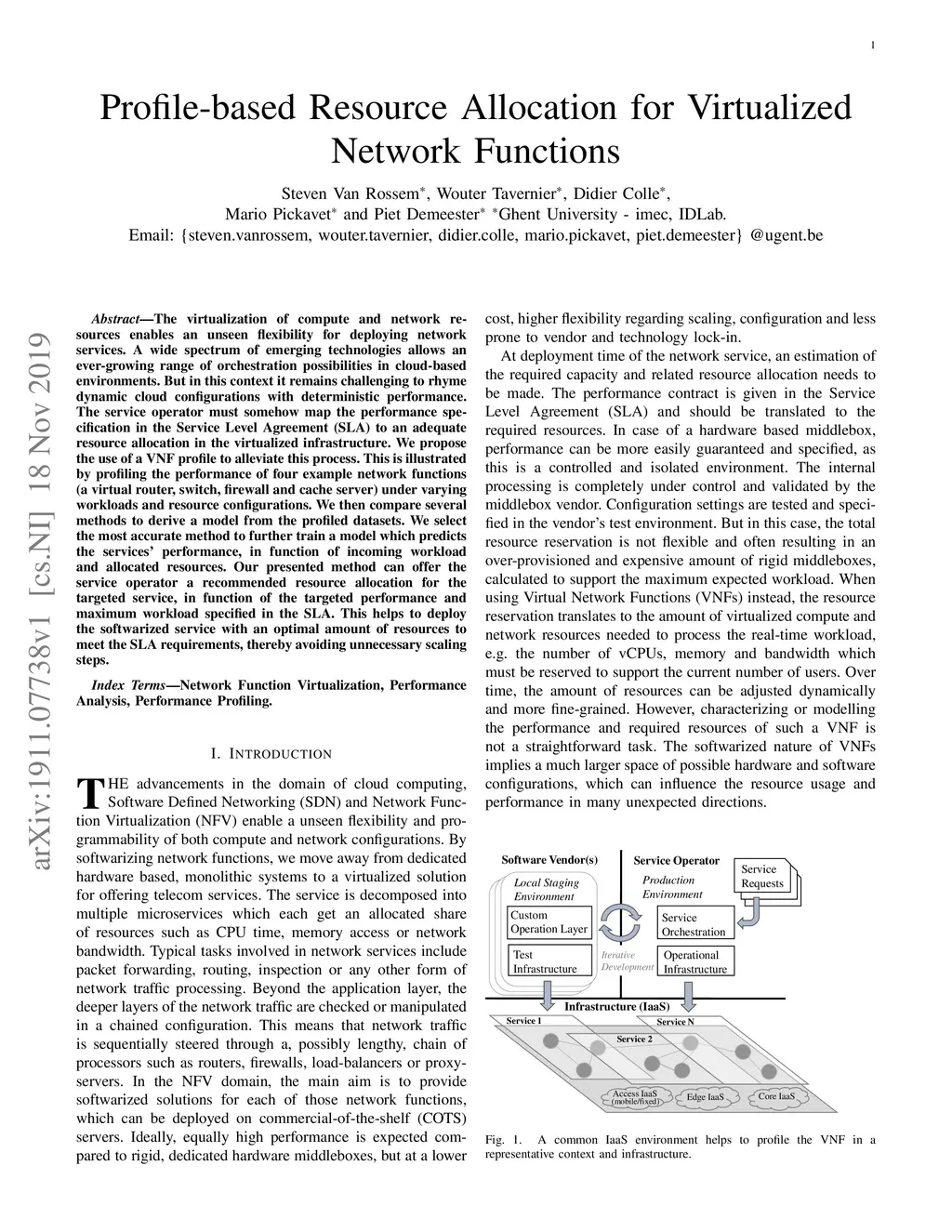 The virtualization of compute and network resources enables an unseen flexibility for deploying network services. A wide spectrum of emerging technologies allows an ever-growing range of orchestration possibilities in cloud-based environments. But in this context it remains challenging to rhyme dynamic cloud configurations with deterministic performance. The service operator must somehow map the performance specification in the Service Level Agreement (SLA) to an adequate resource allocation in the virtualized infrastructure. We propose the use of a VNF profile to alleviate this process. This is illustrated by profiling the performance of four example network functions (a virtual router, switch, firewall and cache server) under varying workloads and resource configurations. We then compare several methods to derive a model from the profiled datasets. We select the most accurate method to further train a model which predicts the services' performance, in function of incoming workload and allocated resources. Our presented method can offer the service operator a recommended resource allocation for the targeted service, in function of the targeted performance and maximum workload specified in the SLA. This helps to deploy the softwarized service with an optimal amount of resources to meet the SLA requirements, thereby avoiding unnecessary scaling steps.