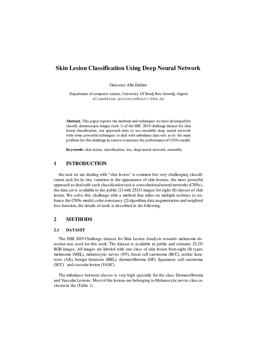 This paper reports the methods and techniques we have developed for classify dermoscopic images (task 1) of the ISIC 2019 challenge dataset for skin lesion classification, our approach aims to use ensemble deep neural network with some powerful techniques to deal with unbalance data sets as its the main problem for this challenge in a move to increase the performance of CNNs model.