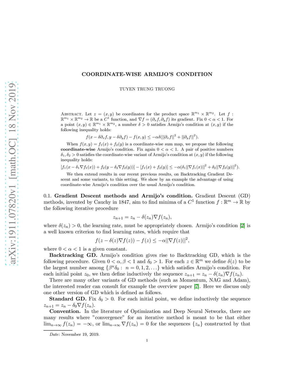 Let be coordinates for the product space . Let be a function, and its gradient. Fix . For a point , a number satisfies Armijo's condition at if the following inequality holds: \begin{eqnarray*} f(x-\delta \partial _xf,y-\delta \partial _yf)-f(x,y)\leq -\alpha \delta (||\partial _xf||^2+||\partial _yf||^2). \end{eqnarray*} When is a coordinate-wise sum map, we propose the following {\bf coordinate-wise} Armijo's condition. Fix again . A pair of positive numbers satisfies the coordinate-wise variant of Armijo's condition at if the following inequality holds: \begin{eqnarray*} [f_1(x-\delta _1\nabla f_1(x))+f_2(y-\delta _2\nabla f_2(y))]-[f_1(x)+f_2(y)]\leq -\alpha (\delta _1||\nabla f_1(x)||^2+\delta _2||\nabla f_2(y)||^2). \end{eqnarray*} We then extend results in our recent previous results, on Backtracking Gradient Descent and some variants, to this setting. We show by an example the advantage of using coordinate-wise Armijo's condition over the usual Armijo's condition.
