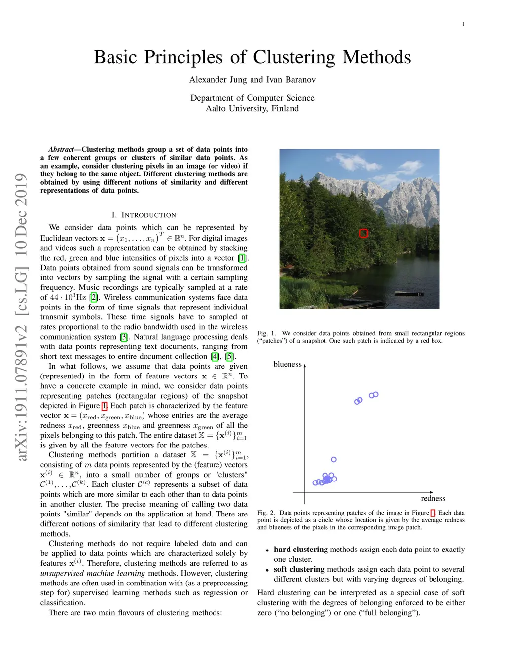 Clustering methods group a set of data points into a few coherent groups or clusters of similar data points. As an example, consider clustering pixels in an image (or video) if they belong to the same object. Different clustering methods are obtained by using different notions of similarity and different representations of data points.