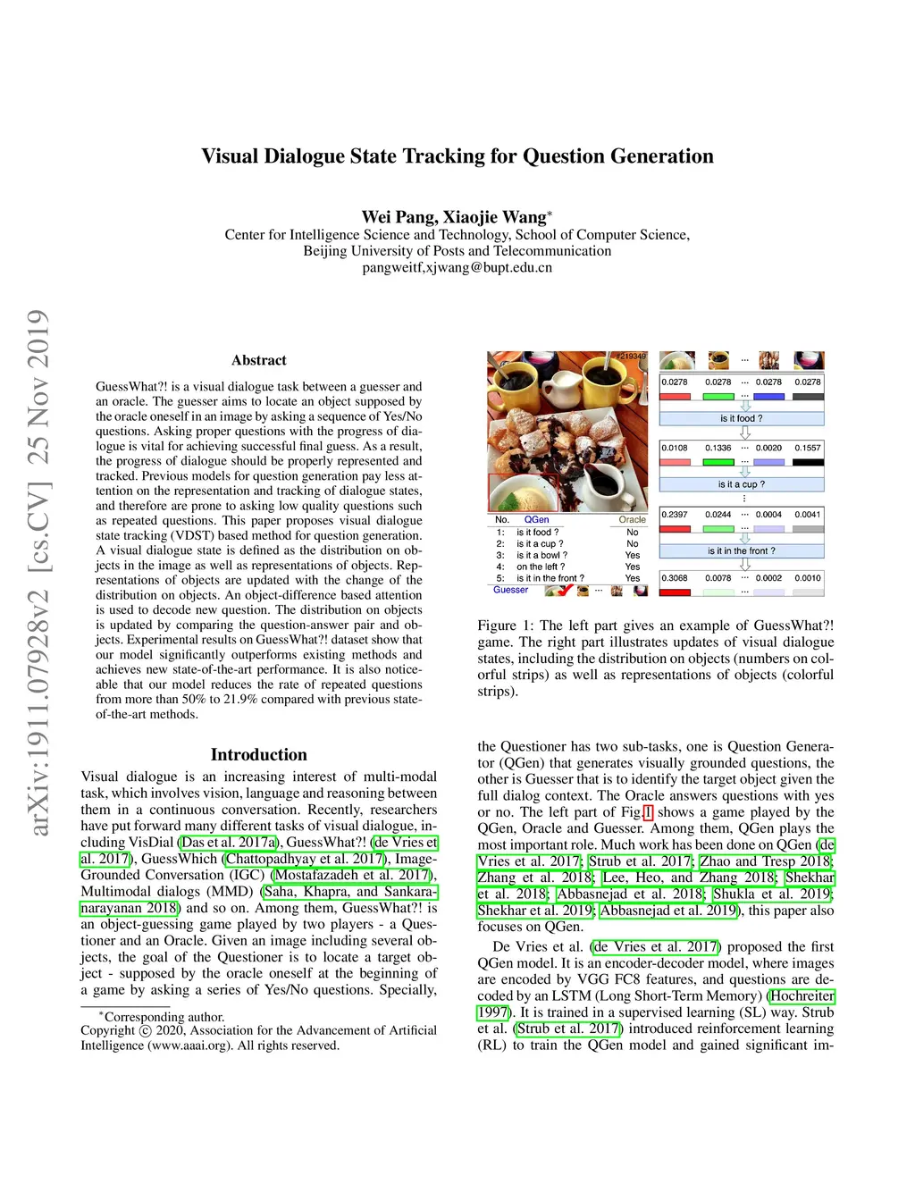 GuessWhat?! is a visual dialogue task between a guesser and an oracle. The guesser aims to locate an object supposed by the oracle oneself in an image by asking a sequence of Yes/No questions. Asking proper questions with the progress of dialogue is vital for achieving successful final guess. As a result, the progress of dialogue should be properly represented and tracked. Previous models for question generation pay less attention on the representation and tracking of dialogue states, and therefore are prone to asking low quality questions such as repeated questions. This paper proposes visual dialogue state tracking (VDST) based method for question generation. A visual dialogue state is defined as the distribution on objects in the image as well as representations of objects. Representations of objects are updated with the change of the distribution on objects. An object-difference based attention is used to decode new question. The distribution on objects is updated by comparing the question-answer pair and objects. Experimental results on GuessWhat?! dataset show that our model significantly outperforms existing methods and achieves new state-of-the-art performance. It is also noticeable that our model reduces the rate of repeated questions from more than 50% to 21.9% compared with previous state-of-the-art methods.
