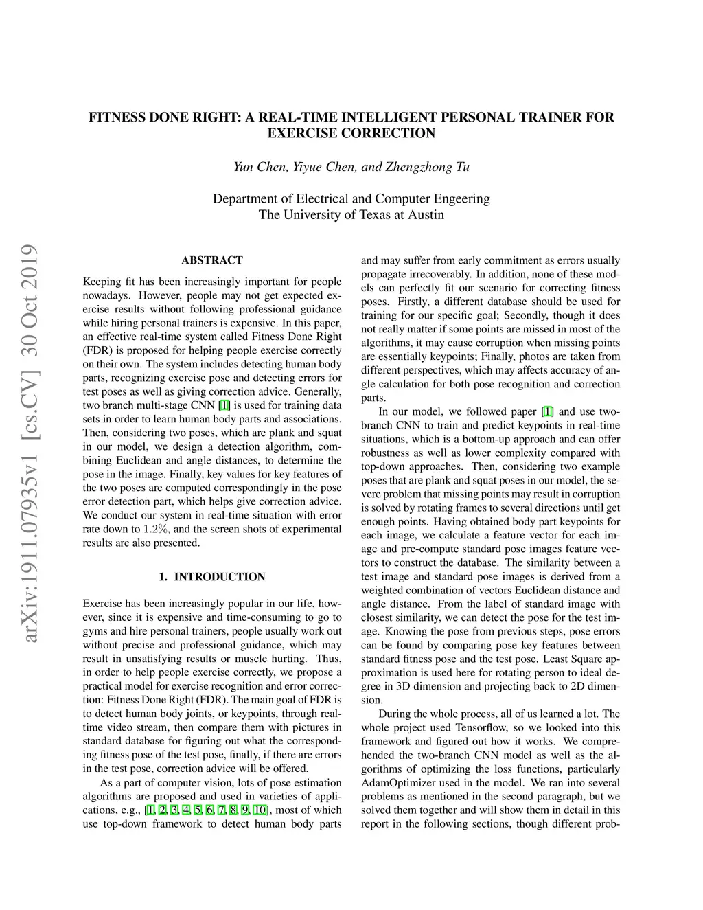 Keeping fit has been increasingly important for people nowadays. However, people may not get expected exercise results without following professional guidance while hiring personal trainers is expensive. In this paper, an effective real-time system called Fitness Done Right (FDR) is proposed for helping people exercise correctly on their own. The system includes detecting human body parts, recognizing exercise pose and detecting errors for test poses as well as giving correction advice. Generally, two branch multi-stage CNN is used for training data sets in order to learn human body parts and associations. Then, considering two poses, which are plank and squat in our model, we design a detection algorithm, combining Euclidean and angle distances, to determine the pose in the image. Finally, key values for key features of the two poses are computed correspondingly in the pose error detection part, which helps give correction advice. We conduct our system in real-time situation with error rate down to , and the screenshots of experimental results are also presented.