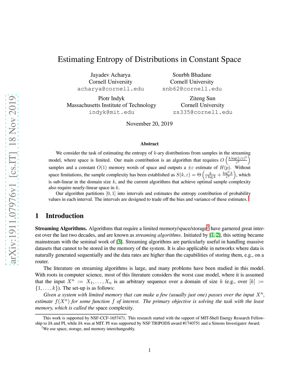 We consider the task of estimating the entropy of -ary distributions from samples in the streaming model, where space is limited. Our main contribution is an algorithm that requires samples and a constant memory words of space and outputs a estimate of . Without space limitations, the sample complexity has been established as , which is sub-linear in the domain size , and the current algorithms that achieve optimal sample complexity also require nearly-linear space in . Our algorithm partitions into intervals and estimates the entropy contribution of probability values in each interval. The intervals are designed to trade off the bias and variance of these estimates.