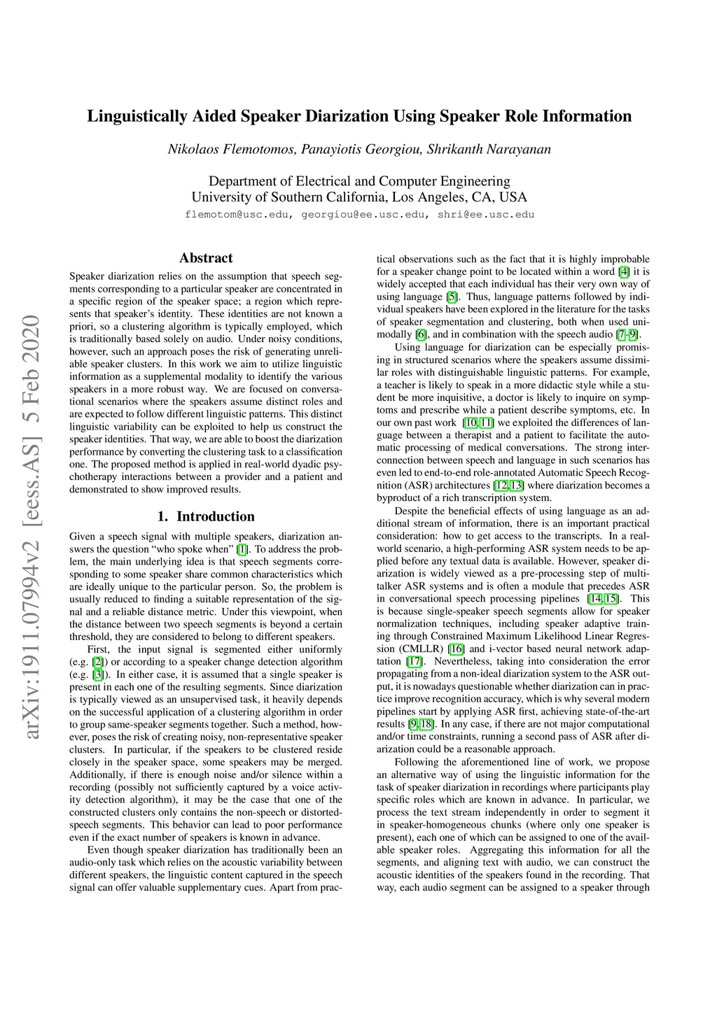 Speaker diarization relies on the assumption that speech segments corresponding to a particular speaker are concentrated in a specific region of the speaker space; a region which represents that speaker's identity. These identities are not known a priori, so a clustering algorithm is typically employed, which is traditionally based solely on audio. Under noisy conditions, however, such an approach poses the risk of generating unreliable speaker clusters. In this work we aim to utilize linguistic information as a supplemental modality to identify the various speakers in a more robust way. We are focused on conversational scenarios where the speakers assume distinct roles and are expected to follow different linguistic patterns. This distinct linguistic variability can be exploited to help us construct the speaker identities. That way, we are able to boost the diarization performance by converting the clustering task to a classification one. The proposed method is applied in real-world dyadic psychotherapy interactions between a provider and a patient and demonstrated to show improved results.