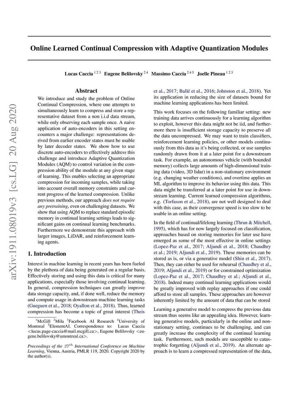 Online Learned Continual Compression with Adaptive Quantization Modules