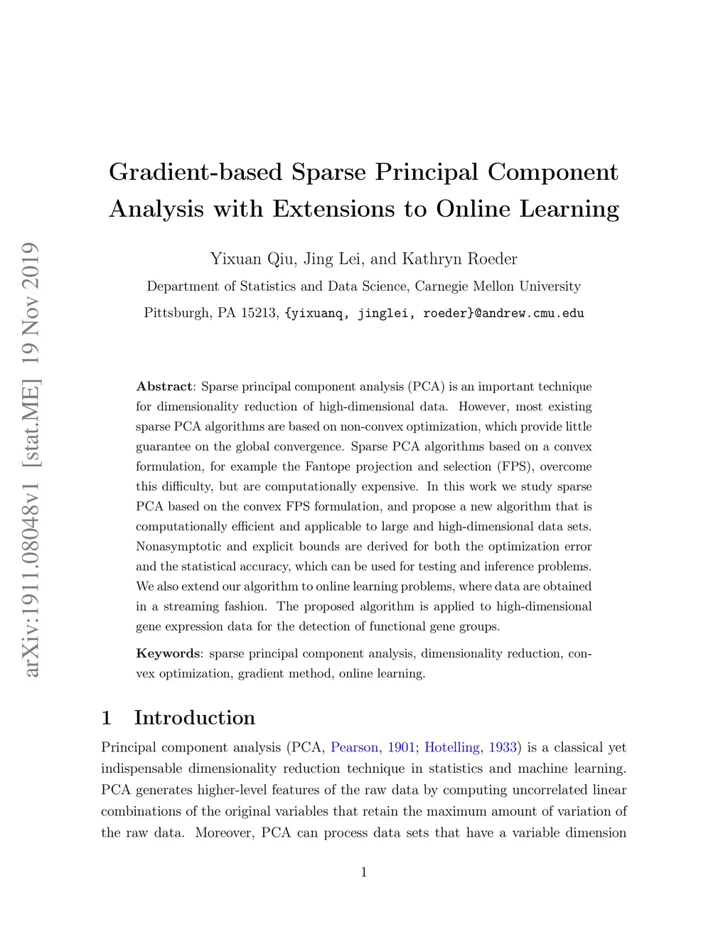 Sparse principal component analysis (PCA) is an important technique for dimensionality reduction of high-dimensional data. However, most existing sparse PCA algorithms are based on non-convex optimization, which provide little guarantee on the global convergence. Sparse PCA algorithms based on a convex formulation, for example the Fantope projection and selection (FPS), overcome this difficulty, but are computationally expensive. In this work we study sparse PCA based on the convex FPS formulation, and propose a new algorithm that is computationally efficient and applicable to large and high-dimensional data sets. Nonasymptotic and explicit bounds are derived for both the optimization error and the statistical accuracy, which can be used for testing and inference problems. We also extend our algorithm to online learning problems, where data are obtained in a streaming fashion. The proposed algorithm is applied to high-dimensional gene expression data for the detection of functional gene groups.