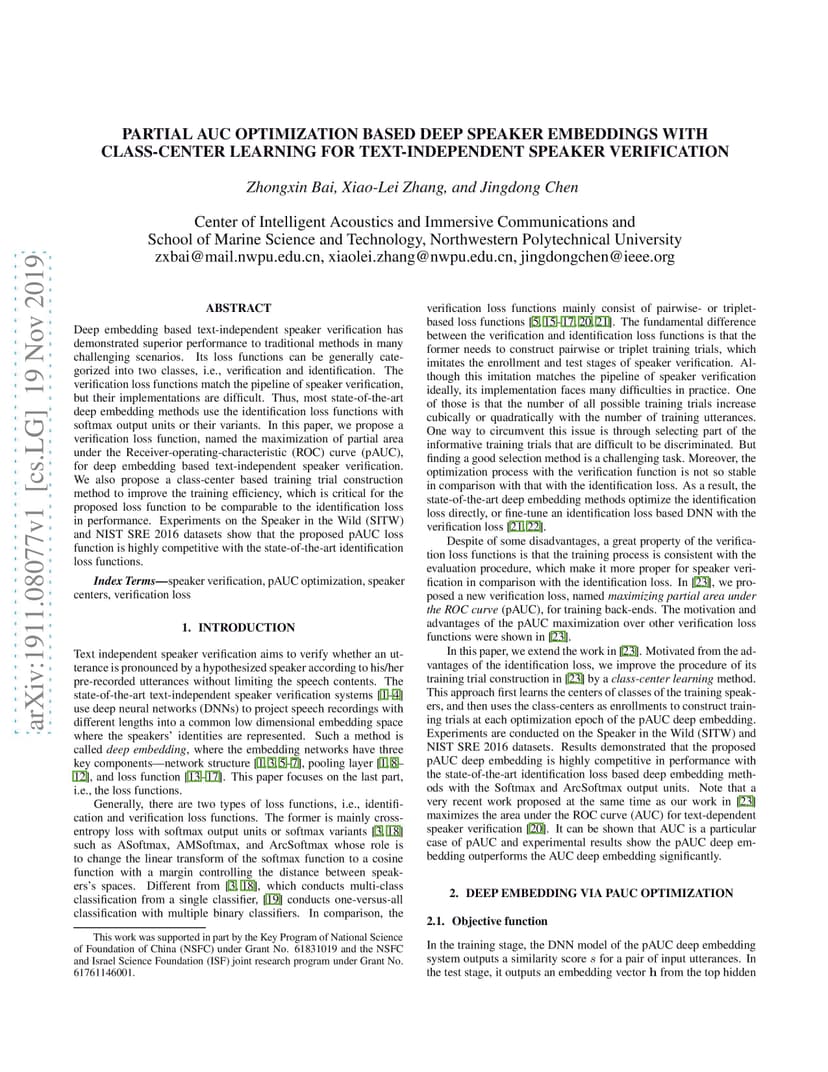 Deep embedding based text-independent speaker verification has demonstrated superior performance to traditional methods in many challenging scenarios. Its loss functions can be generally categorized into two classes, i.e., verification and identification. The verification loss functions match the pipeline of speaker verification, but their implementations are difficult. Thus, most state-of-the-art deep embedding methods use the identification loss functions with softmax output units or their variants. In this paper, we propose a verification loss function, named the maximization of partial area under the Receiver-operating-characteristic (ROC) curve (pAUC), for deep embedding based text-independent speaker verification. We also propose a class-center based training trial construction method to improve the training efficiency, which is critical for the proposed loss function to be comparable to the identification loss in performance. Experiments on the Speaker in the Wild (SITW) and NIST SRE 2016 datasets show that the proposed pAUC loss function is highly competitive with the state-of-the-art identification loss functions.